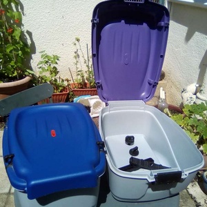 Keter bicycle rack box. Fits easily on to standard bicycle luggage rack. Lid has lockable clip, but can also be secured with a small padlock. The lid is shaped so that further luggage can be strapped to the top with bungee cords. Two available - one Grey / Blue, the other Grey / Purple. One or two minor scuffs, but in overall good condition. Complete with mounting brackets. I have seen examples of these in poor condition selling on Ebay for £30 each, but we need the space so I am happy to accept £15 (or £25 for the two) for these good-conditioned examples. For collection from Brixham.