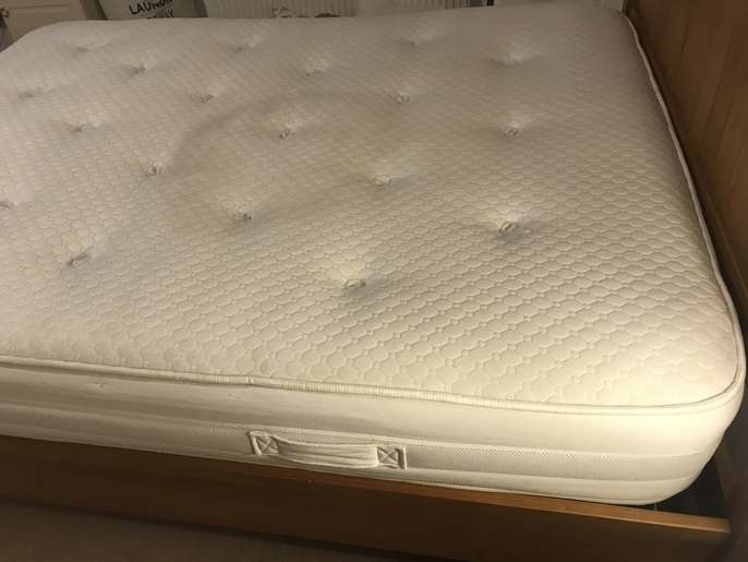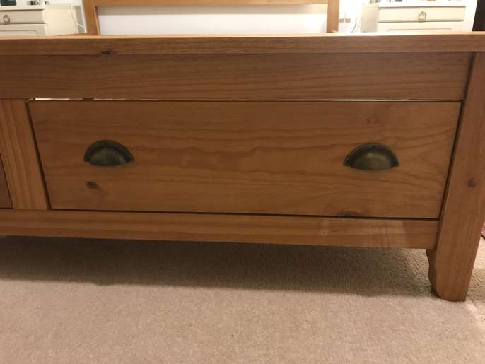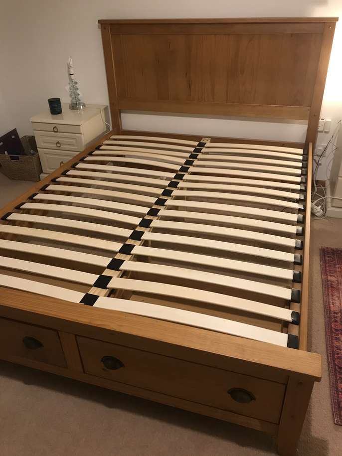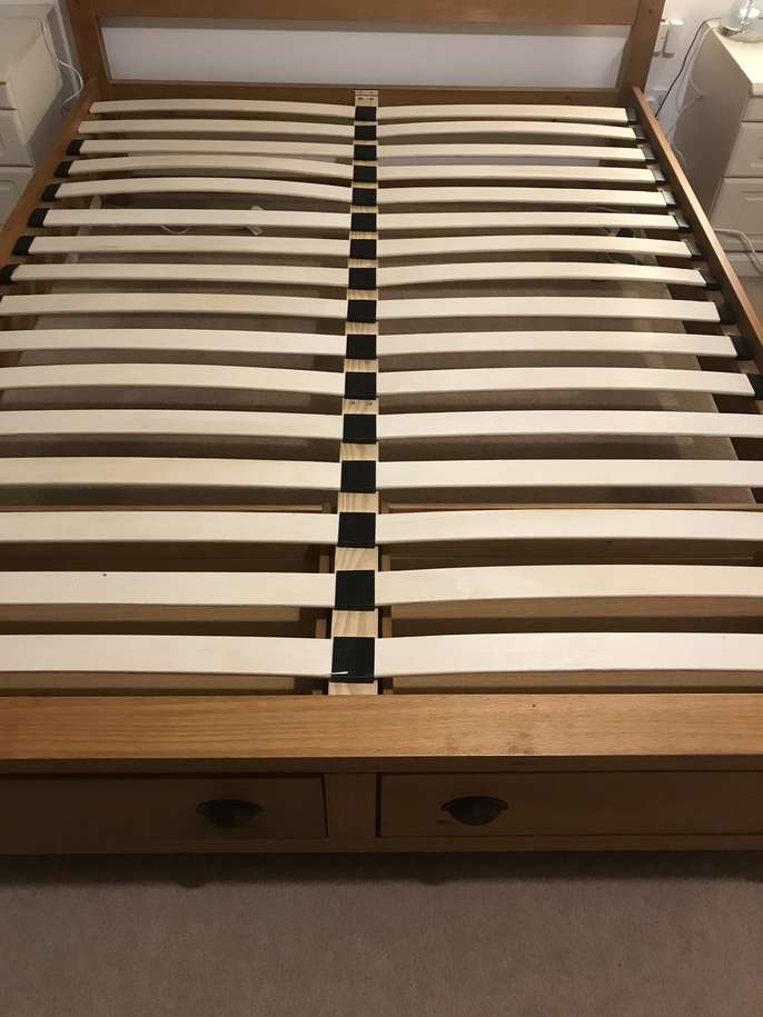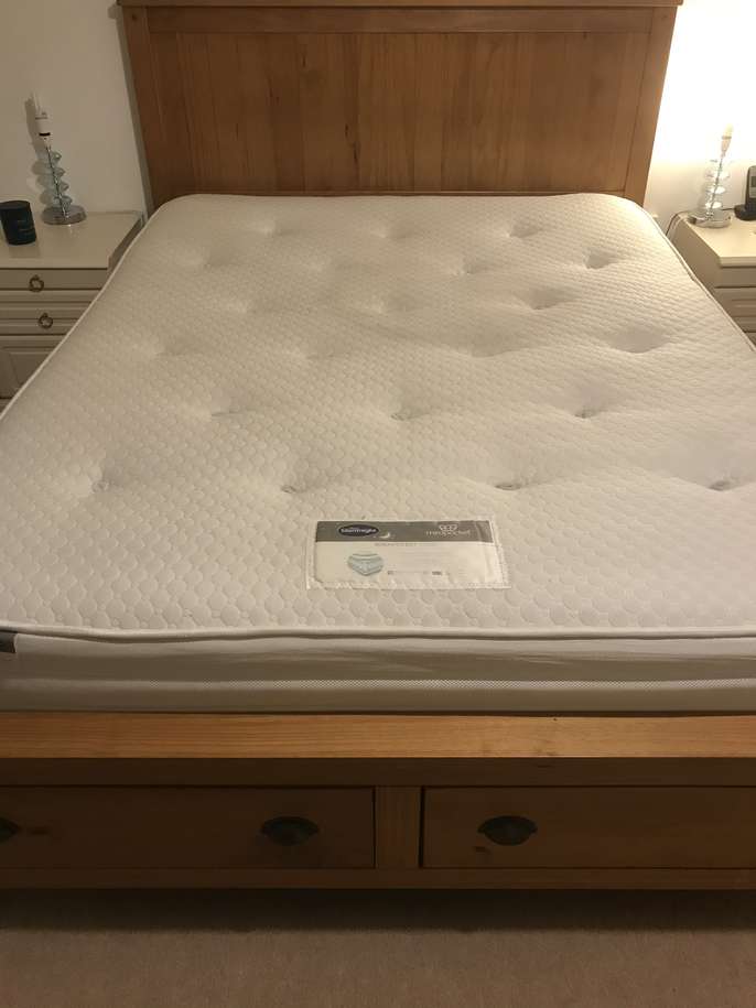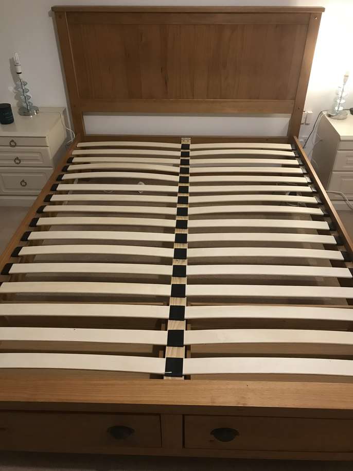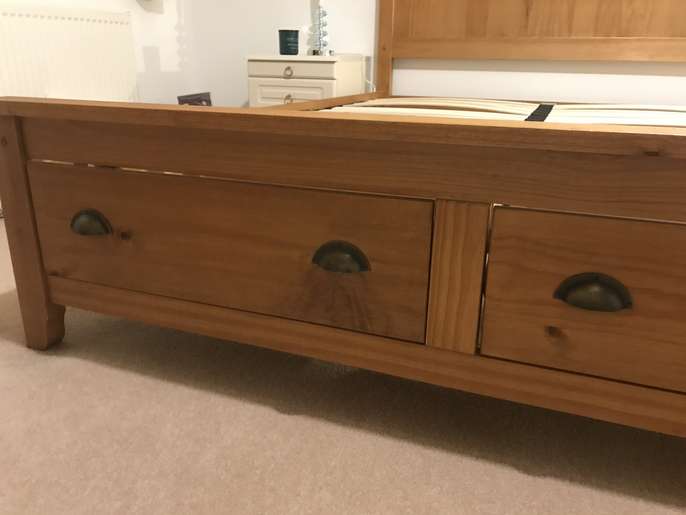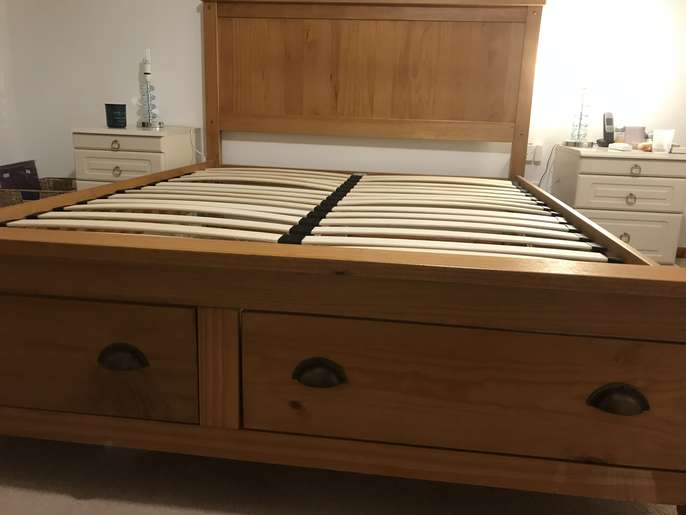 Lovely solid pine King bed frame with two large drawers at end, & matching bedside cabinets. A couple of marks on drawers at end of bed. Also two black holders missing for slats which doesn’t affect the structure - see pics. It’s a solid comfortable bed which is 3yrs old. The mattress is clean as I steam clean it regularly, however there is a drinks stain - which has been steam cleaned within an inch of its life, but still shows, and a couple of other wear & tear marks too. It’s a comfortable firm pocket divan, bought at the same time as the bedroom set. Price for all including mattress / £70 Without mattress / £60