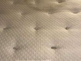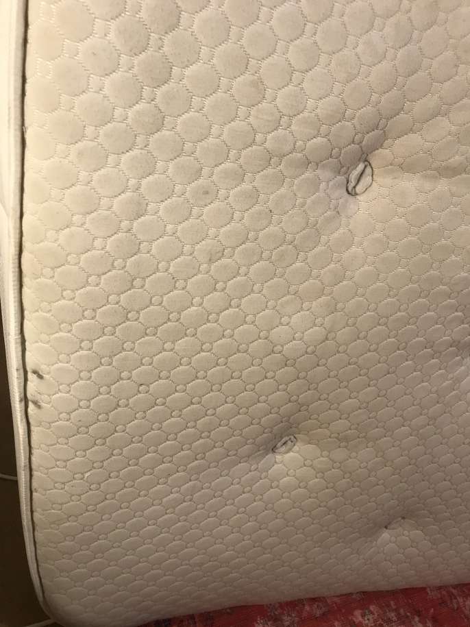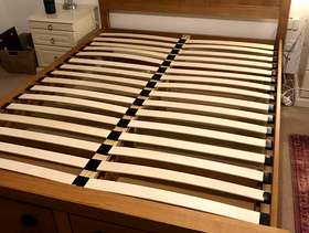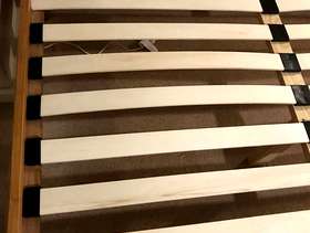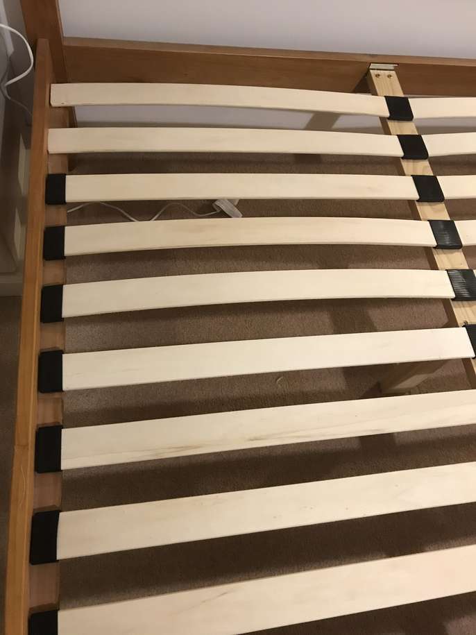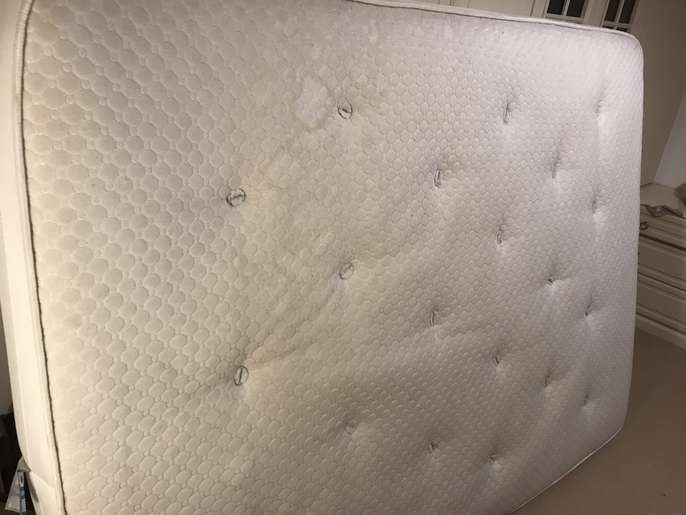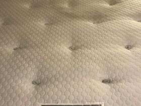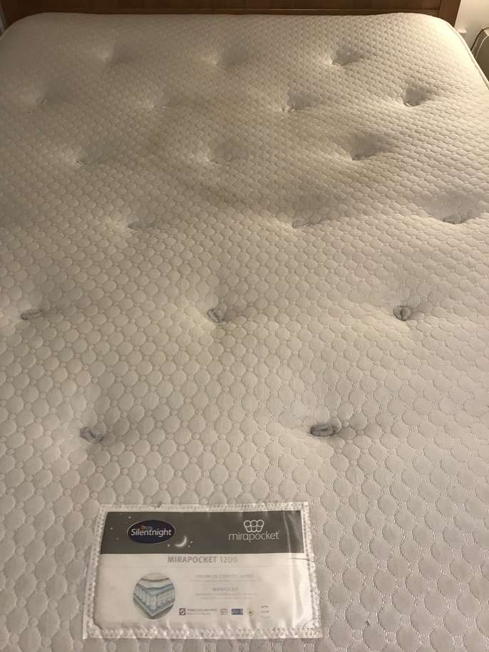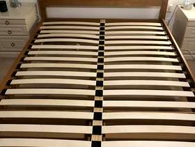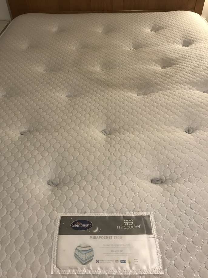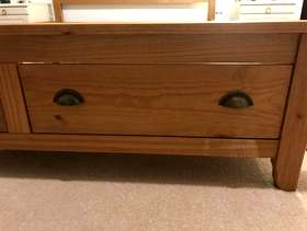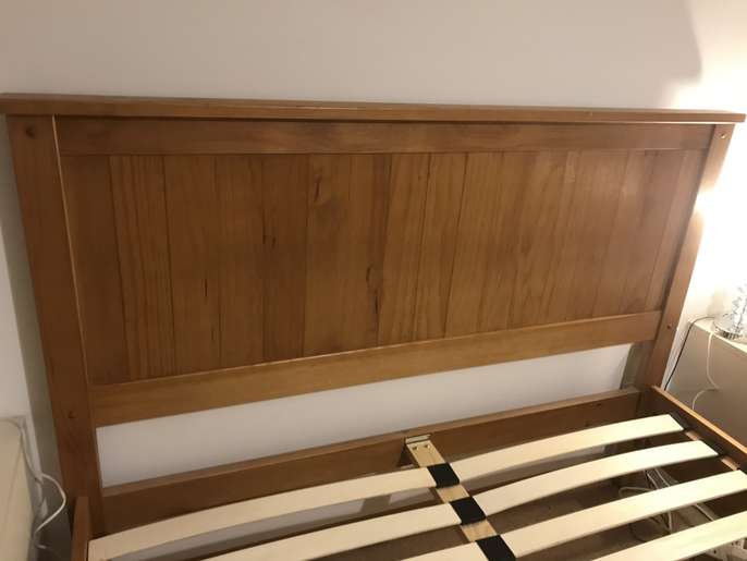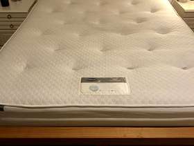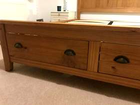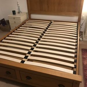 Lovely solid pine King bed frame with two large drawers at end, & matching bedside cabinets. A couple of marks on drawers at end of bed. Also two black holders missing for slats which doesn’t affect the structure - see pics. It’s a solid comfortable bed which is 3yrs old. The mattress is clean as I steam clean it regularly, however there is a drinks stain - which has been steam cleaned within an inch of its life, but still shows, and a couple of other wear & tear marks too. It’s a comfortable firm pocket divan, bought at the same time as the bedroom set. Price for all including mattress / £70 Without mattress / £60