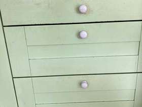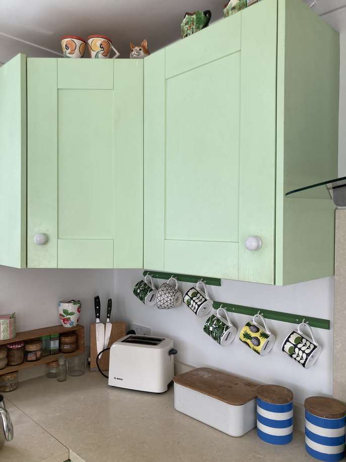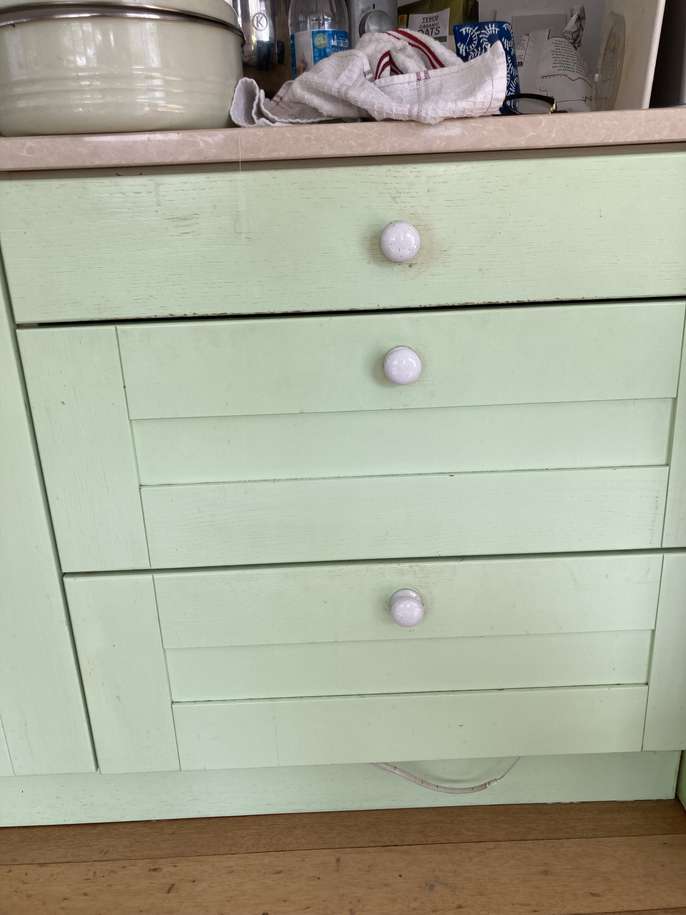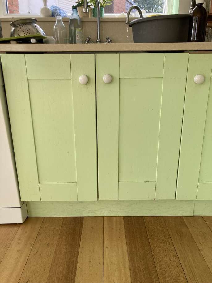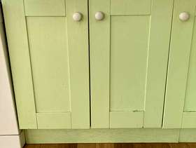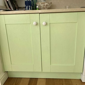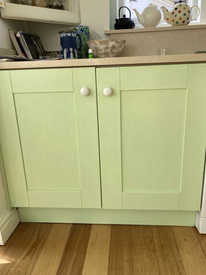 Solid oak kitchen cabinets. Spray painted in a light willow green. There are a few small chips, but they could be sanded down and resprayed or painted again. Free to anyone who could use them!