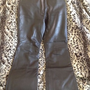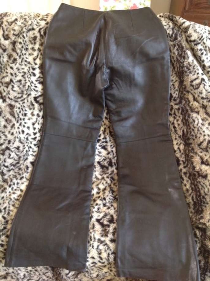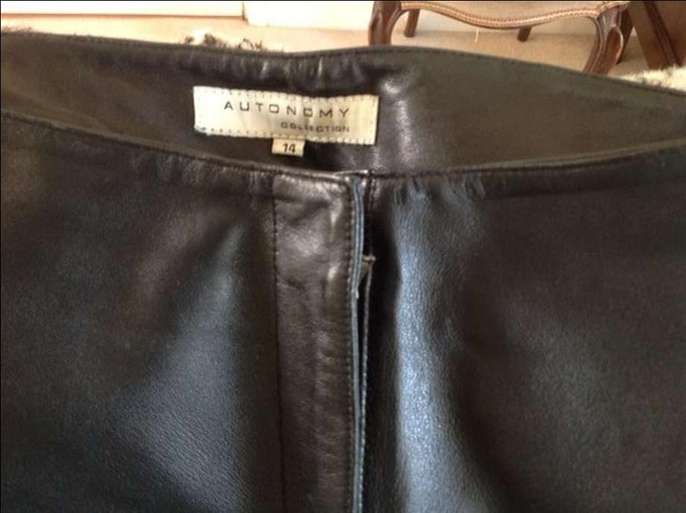 This is a used pair of ladies leather trousers. 100% leather trousers - lining is 100% polyester. They have been worn just a few times. In good condition - no rips or tears! Brand: Autonomy Size: 14 Note that these are not skinny trousers. Zip at front. No pockets. Collect from Guildford GU1.