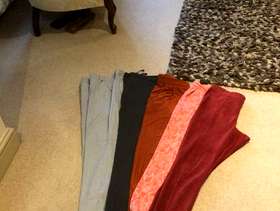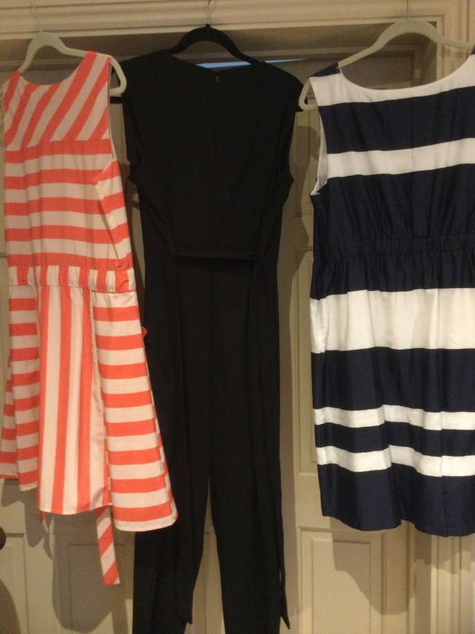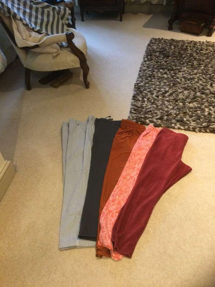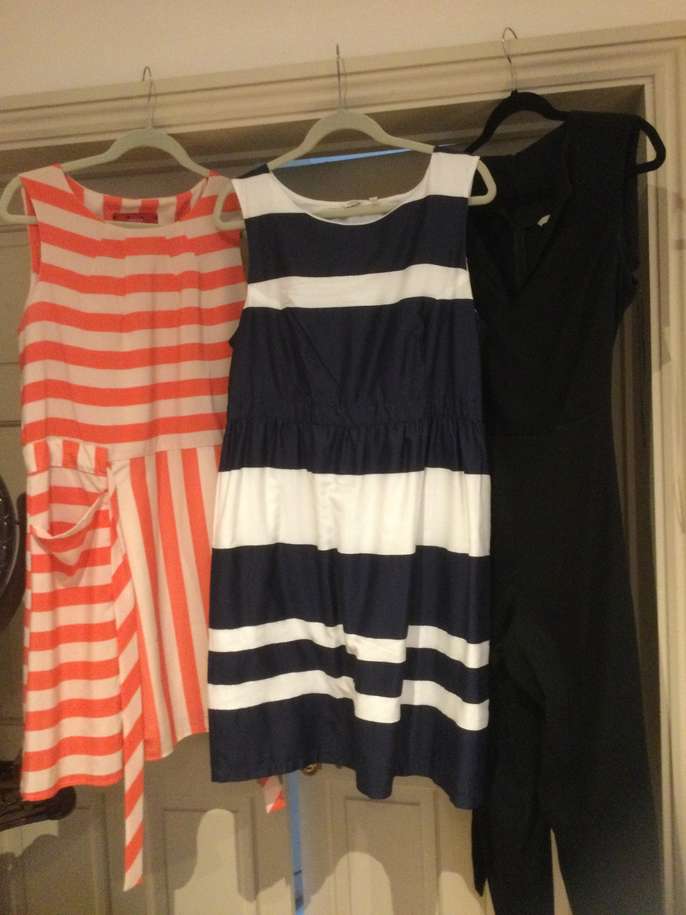 I have for sale 2 summer dresses, never worn, navy is fat face and coral is next, 1 black jumpsuit TU never worn, 5 pairs trousers, various makes all used, and 1 blouse Oasis used, all size 16, although I think dresses are small . Having major de clutter before Christmas