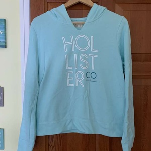 Light blue ladies Hollister hooded jumper. Perfect for the summer months as it’s thin and light Size: Large Excellent condition and hardly ever been worn.