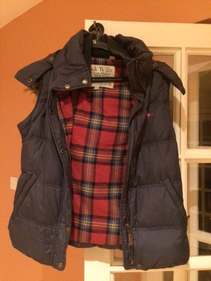 Jack Wills Size: 10 UK, 6 US Colour: Dark Blue Shell: 100% Nylon Classic check Thermal Lining: 100% Cotton Filling: 70% Duck Down, 30% Duck Feather Detachable popper hood with faux fur trim Front zip fastener with popper flap 2 x front pockets with zips One inner popper pocket Used lightly & still in very good condition Collect from Guildford GU1 - near the Spectrum Leisure Centre.
