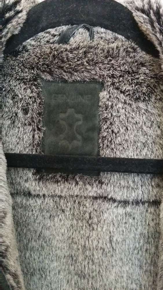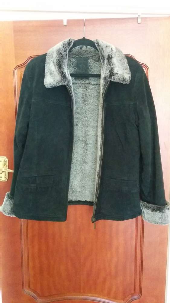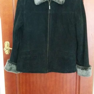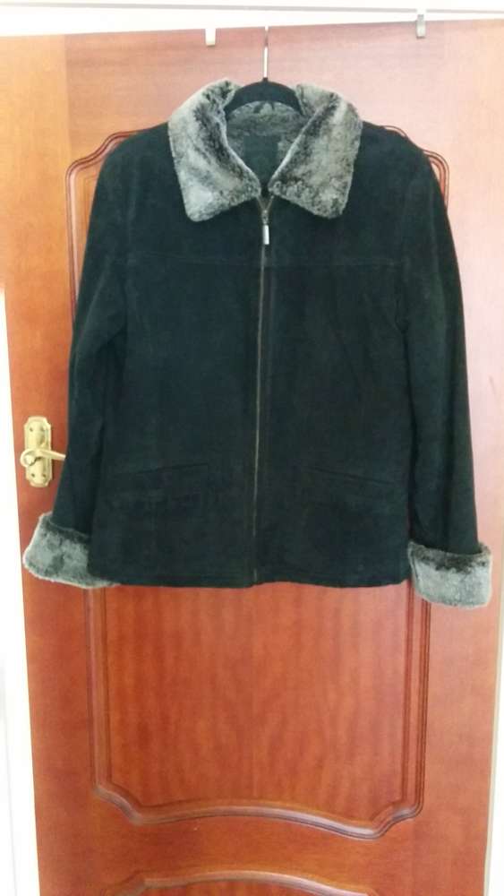 In very good condition, this is a black suede jacket with grey fur lining. Size 12 Available for collection from Stoneleigh KT17