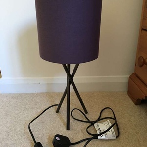 Gunmetal tripod table lamp. Dark purple shade. Includes light bulb. Fully working, hardly used. Switch on cable. 45cm high. Shade is 20cm diameter. Collection only.