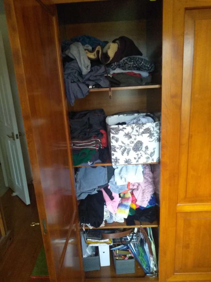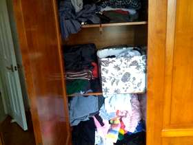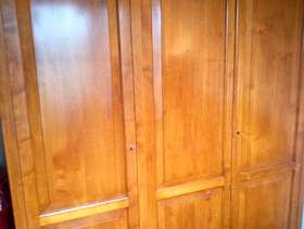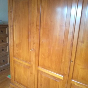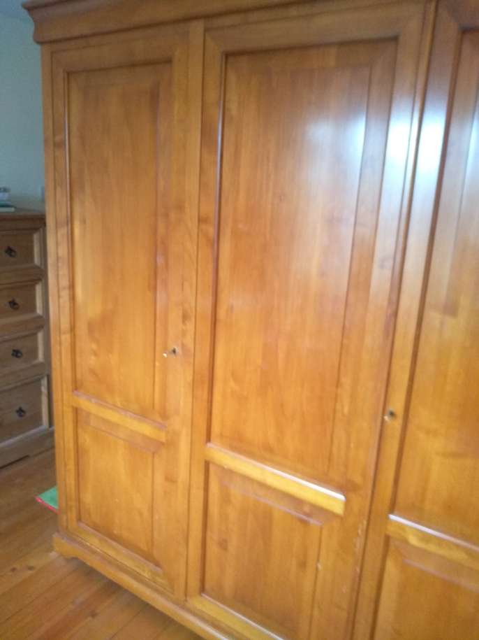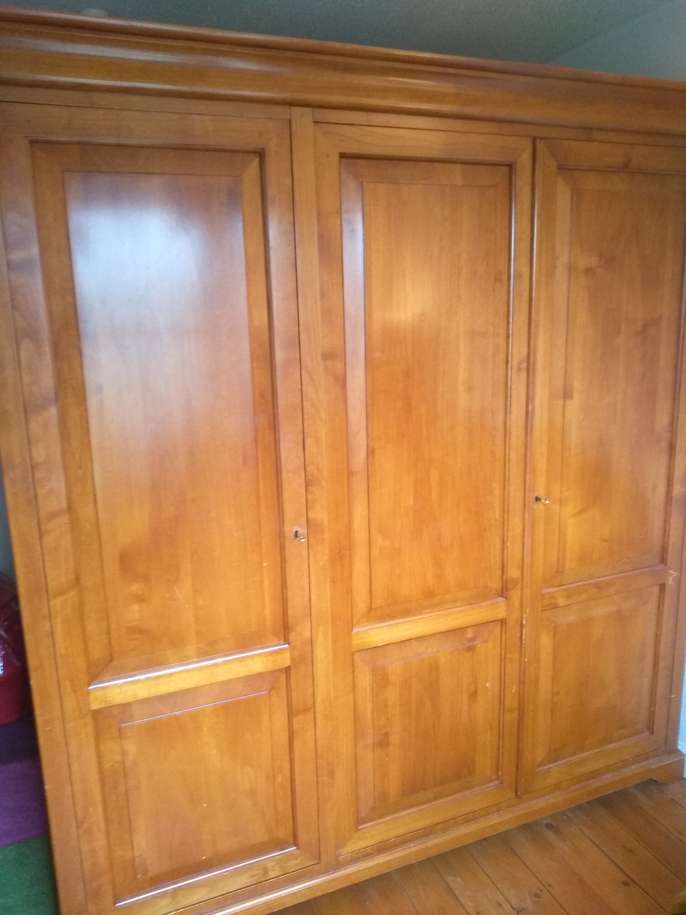 Excellent quality solid wood wardrobe, 3 doors (1 side with 4 shelves and 2 door double rail, see photos), original lock and keys, slight/small scratch on one side of one door (see photos), selling as moving house