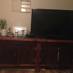 Large chunky cupboard , lots of room inside and lots space on top , was hand made , would be great as a working space and tools in a garage , or you could up cycle it to how you like , maybe even turn it into something else ?