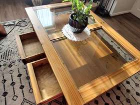 Lovely large solid glass topped coffee table with two drawers Measurements are Length 43 inches Width 27.5 inches Height 17.5 inches