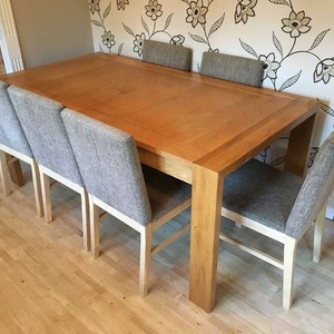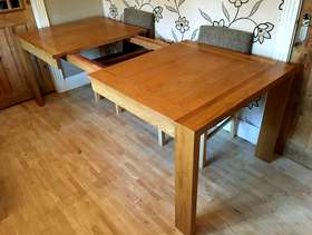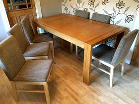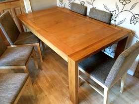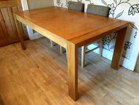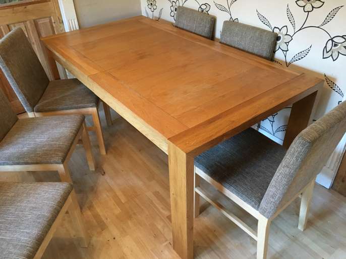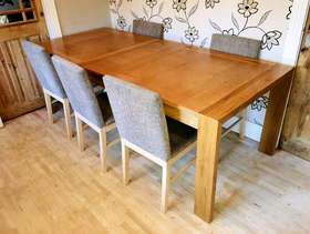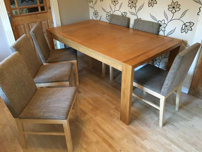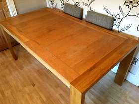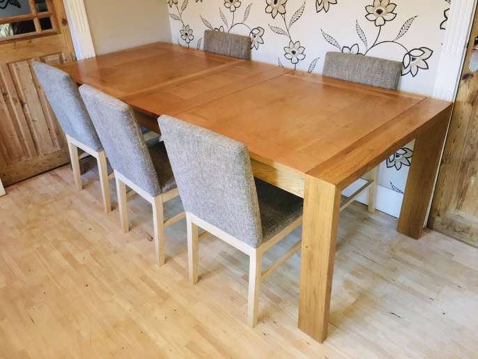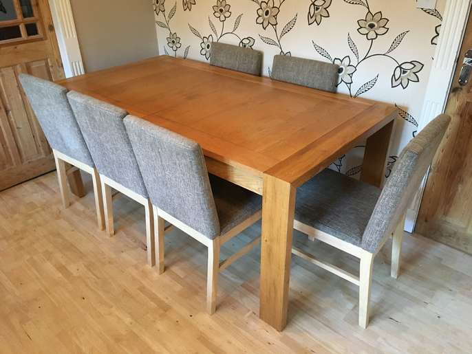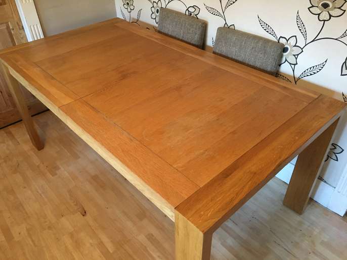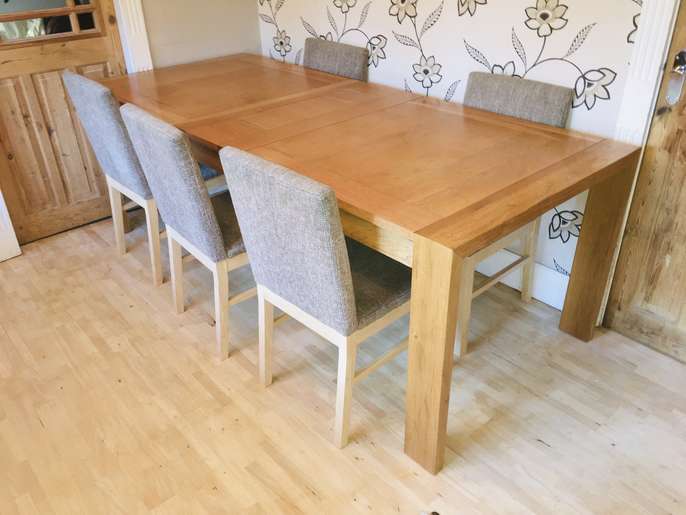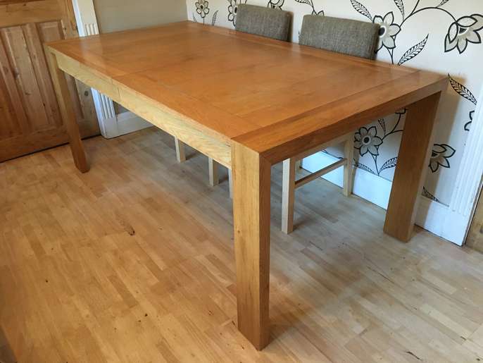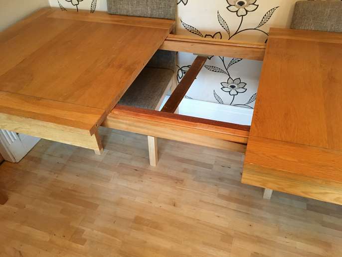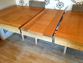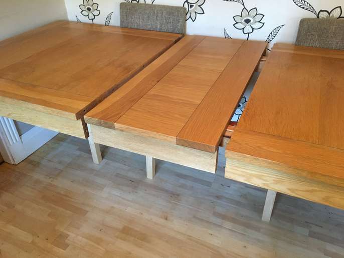 This is a very well made sturdy large extending dining table with 6 chairs( please one of the chairs does have a leg in need of repair) the table is 180 cm long but extends to 224 cm when the center section is added it stands 77 cm and is 94 cm wide i can deliver to the local halifax/bradford area for a £20 delivery charge