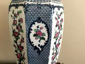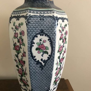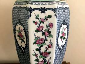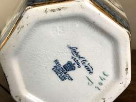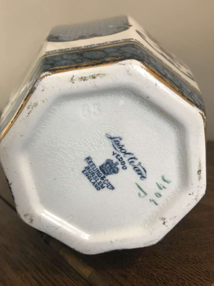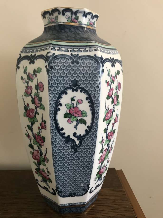 This is a delightful early 20th Century, Burslam pottery Vase, made by Keeling & Co. The pattern is called Yeddo. These underglaze makers mark dates its manufacture to between 1912 and and 1936 It stands 11.5 inches tall and there is some slight wear to the gold band at the neck of the vase from handling over its long lifetime but it is otherwise offered in very good condition with no chips, cracks or crazing.