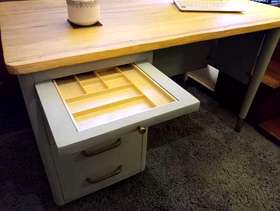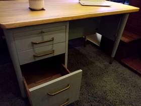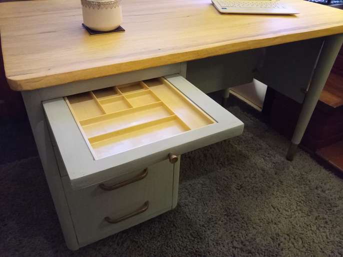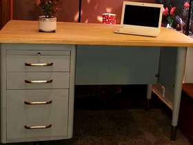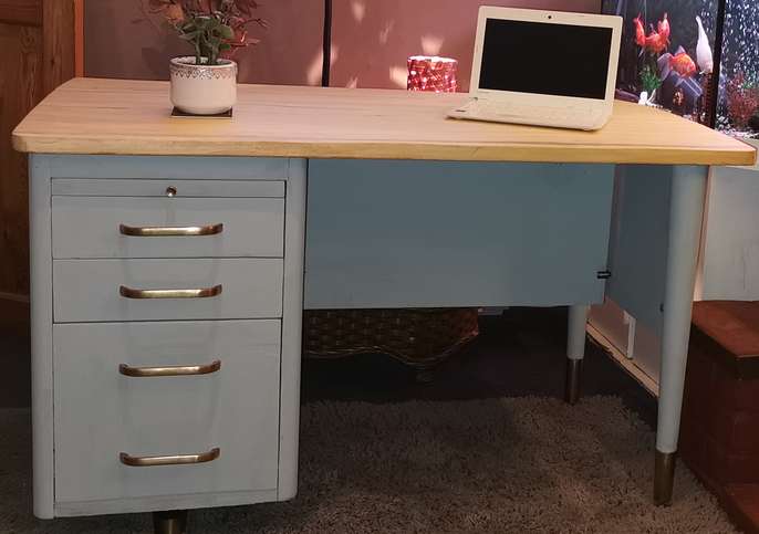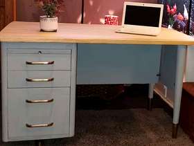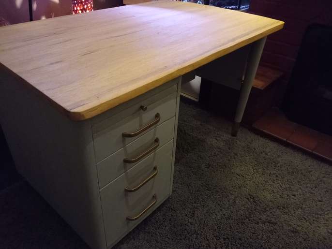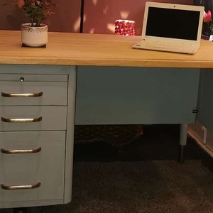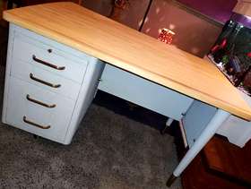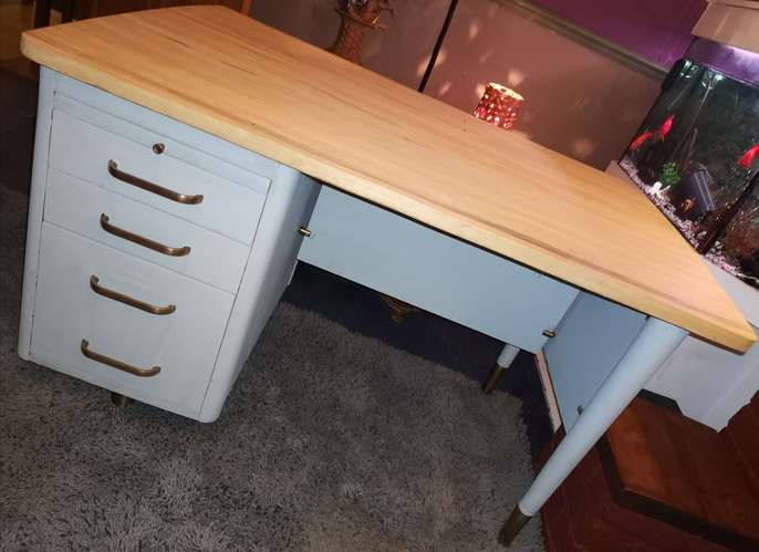Here we have a completely upcycled large office desk for sale. We sanded down all the wood to give it a more modern look, varnished the work top so it is protected, and painted the desk in a Cyan colour. The desk has 3 spacious drawers and also a pull-out tray at the top for all your stationery items. The bottom drawer has two handles but is one large drawer, which is particularly useful for those with bulkier office belongings. Width: 83cm Height: 70cm Length: 121.5cm This is adjustable by 5cm without feet. Please note that due to the weight and size of this item it is for collection only in Hemel Hempstead. We kindly recommend that a large vehicle is used for collection. If you have any inquiries please do not hesitate to contact us and we will be more than happy to help. Check out our other items on our website: https://leymansworkshop.wordpress.com