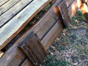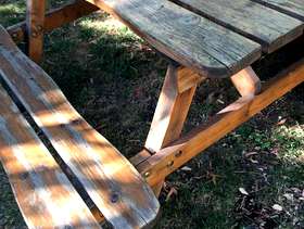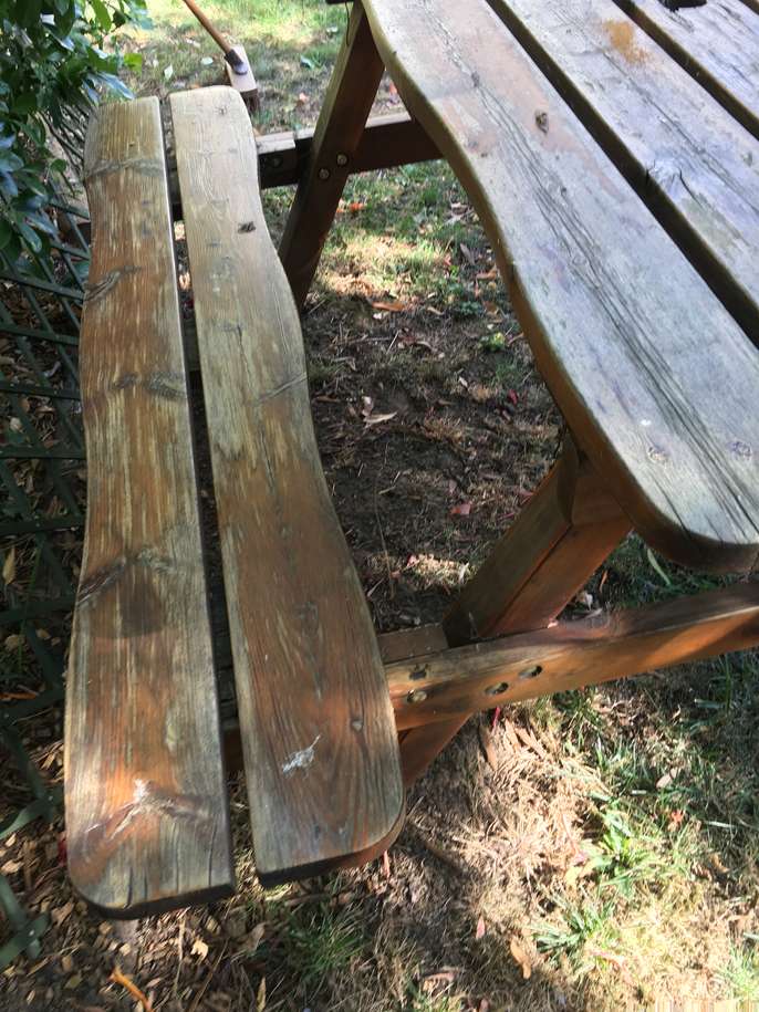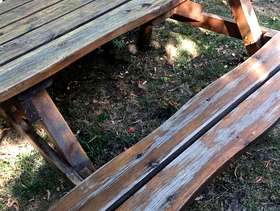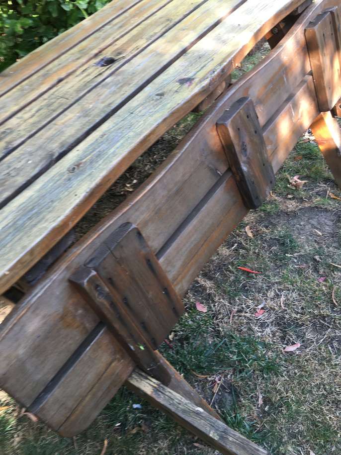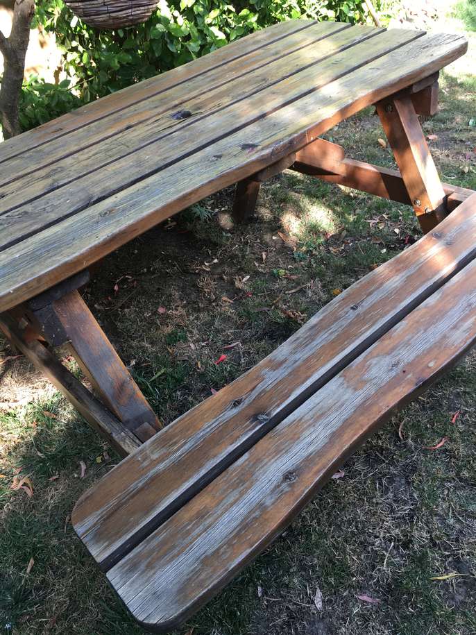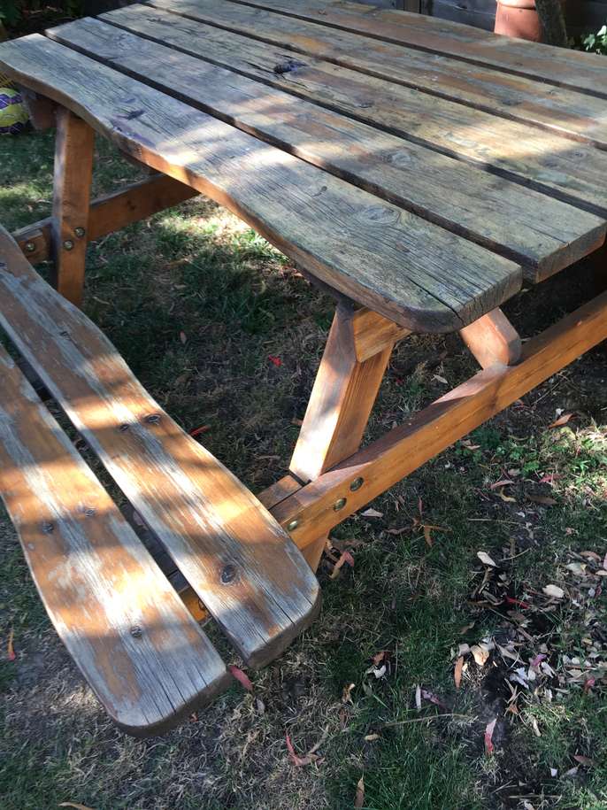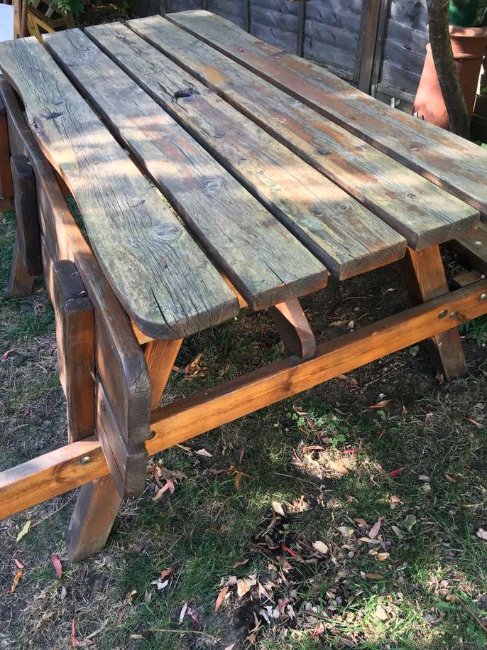 Large outdoor picnic table. Seats 6. Is 5ft length and with seats out makes 5ft width. Had for a few years well used but good condition. Hole for umbrella. Has been sanded and varnished a couple of times. Chairs fold up to stack away. Cost £280 new from garden centre. Will need a van for transport as bulky and heavy. Cash on collection. Buyer collects from Surbiton.