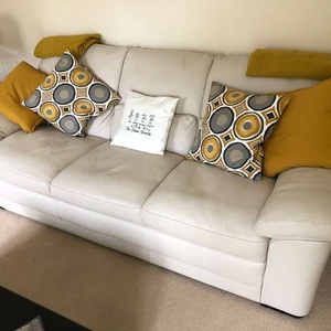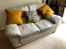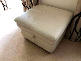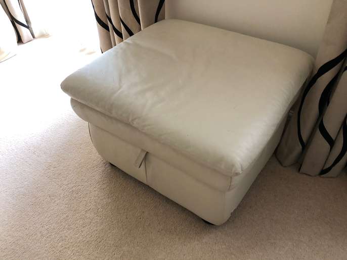 Two off white leather settees and storage footstool. Buyer collects. Note the coloured cushions and blankets are not included SOLD