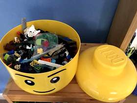 A vast assortment of Lego pieces collected over the years, mostly from kits. Ikea wooden storage unit with 6 drawers. 4 of these have lids. Genuine large Lego head storage. 16 drawer plastic container for very small pieces.
