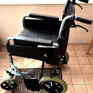 Folding travel wheelchair in very good condition. Footrests are removable, Includes padded seat