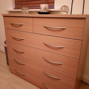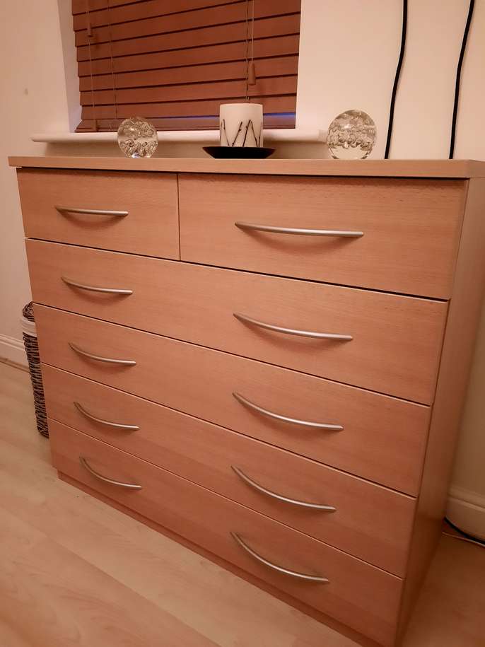 Lima Range from Bensons Beds Beech effect Chest of Drawers 4 large drawers plus 2 small drawers H87cm x W96cm x D43cm Well made quality item Easy slide drawers In very good condition I am also selling the complete range comprising of large double mirrored sliding doors and overbed storage unit Please see my other adverts Buyer to collect from Apsley HP3 9HE Can be viewed before purchase