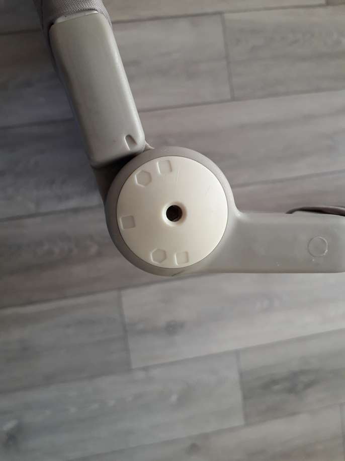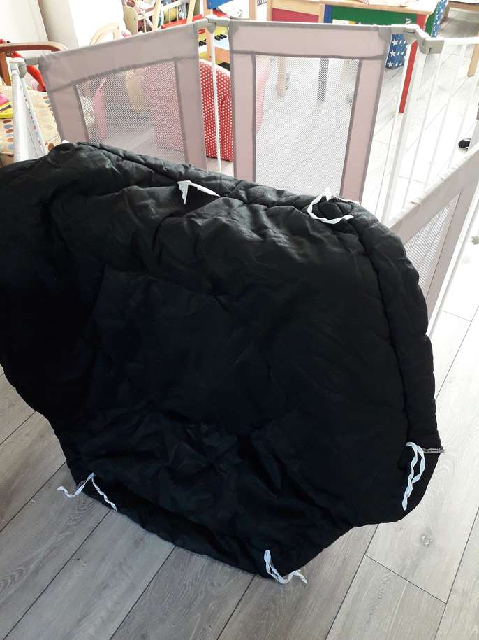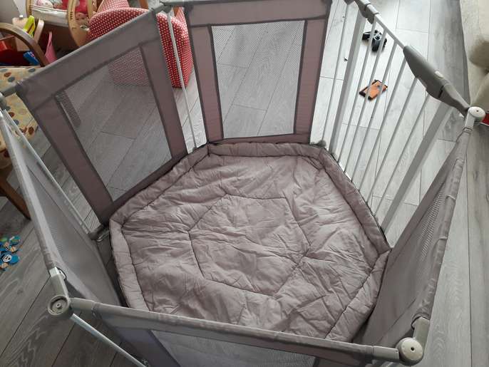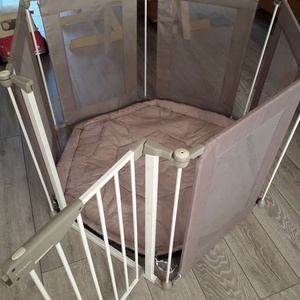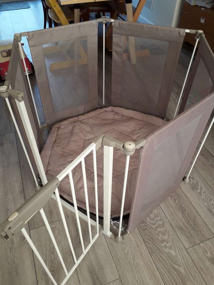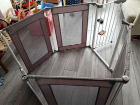 Lindam fabric play pen. Good used condition. Washable mat. You can take sides out to make smaller or can use as a room divider. There is nothing to fix to wall though. I used behind bookcases either side. Once cap missing. see pics, does not affect use.