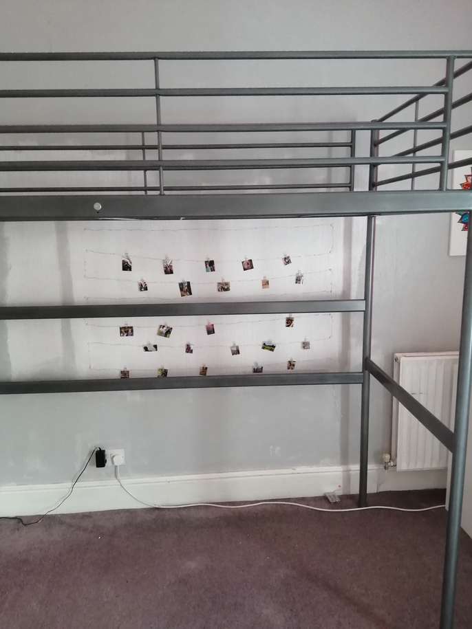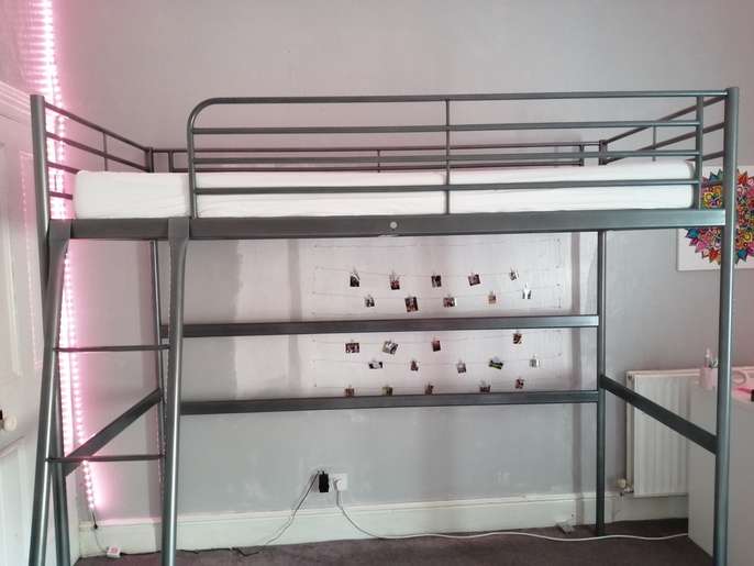 Svarta loft bed ,ideal for small rooms, measures 95cm wide X 204cm long. Height from base of bed to the floor 144cm. Height of bed from top to the bottom 180cm. Ladder can be positioned on the left or right hand side during assembly. Full instructions included. Single mattress included as well if required. Mattress is a standard single memory foam and has fire labels attached (see picture). All items including screws are present.