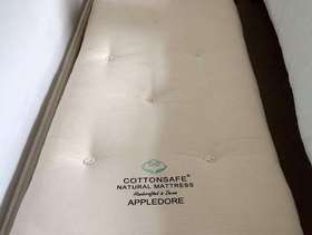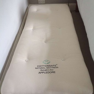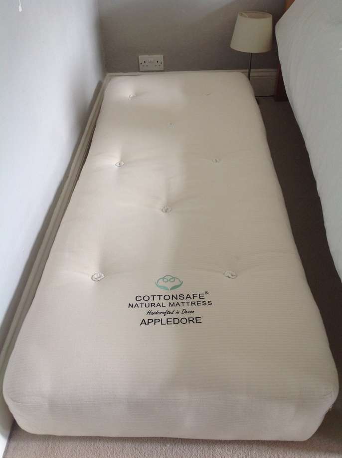 Costs £545 new Used for my toddler. From a smoke, pet, perfume free home Chemical Free All our products are completely chemical free. We use no fire retardant chemicals, foams, bleaches or adhesives. Cottonsafe® Cover Our patented Cottonsafe cover is made from cotton and organic wool. It passes the UK furniture fire regulations naturally without the use of any chemicals. Click here to read more about our Cottonsafe® cover. Springs We use turnable Active Support Technology® heat treated pocket springs. These springs are in their own individual pockets which allows the mattress to adjust and respond to your body weight and ensure correct spine alignment. The Appledore has a 1000 spring count and is available in either a medium or firm tension. It is well known by experienced mattress makers that a 1000 pocket sprung unit gives you the perfect balance between quantity and quality. Appledore Layers • Cottonsafe® outer fabric - Top • Soft British wool layer • White Cotton Rich layer • Needled wool layer • 1000 Pocket spring unit - Centre • Needled wool layer • White Cotton Rich layer • Soft British wool layer • Cottonsafe® outer fabric - Bottom We only use top quality luxury fillings which include extra thick layers of white cotton rich felt, thick wool, a luxury pocket sprung unit using Active Support Technology® and a wool top. The springs are wrapped with a cotton rich border, which is then hand sewn to the frame using natural flax. It is a fully turnable mattress, meaning the fillings are equal on both sides. Because we use natural and organic materials with little or no treatment to keep them as natural as possible there may be an aroma of cotton or wool. Also due to the thick layers we use, a degree of settlement will naturally occur over time. This process may be accelerated by constant pressure or lying in a certain area leaving a slight hollow. This is quite natural; over time this will smooth out when the fillings settle evenly.