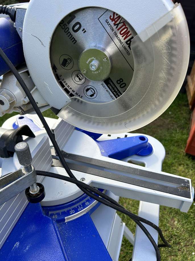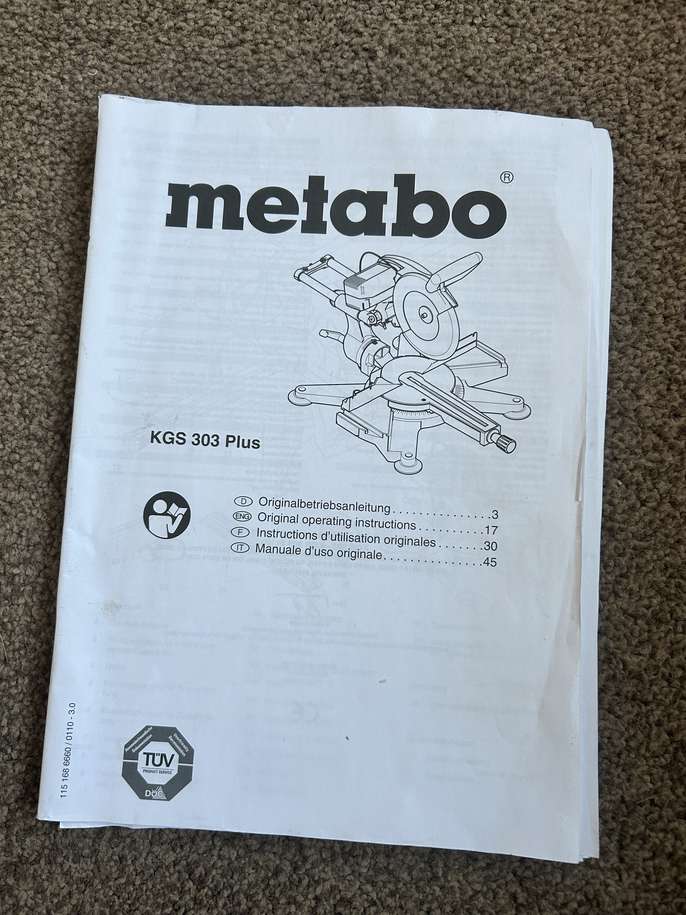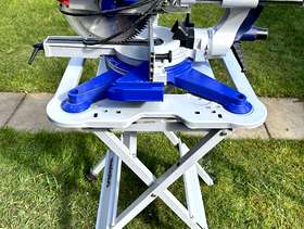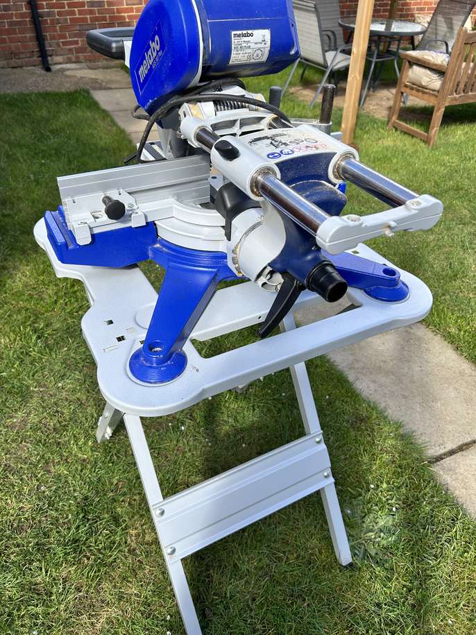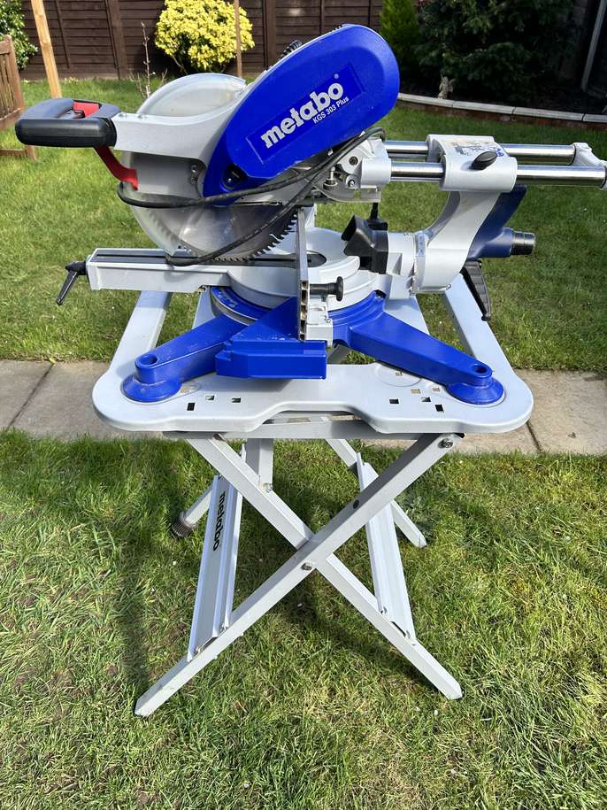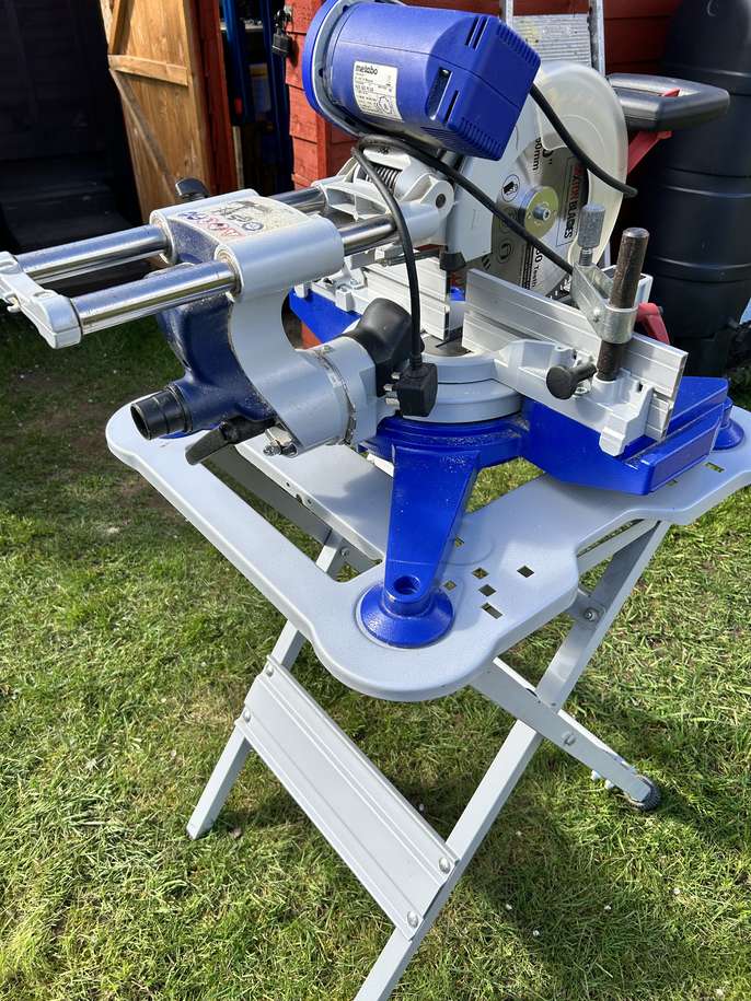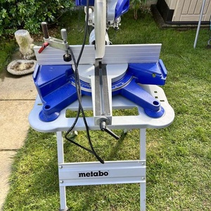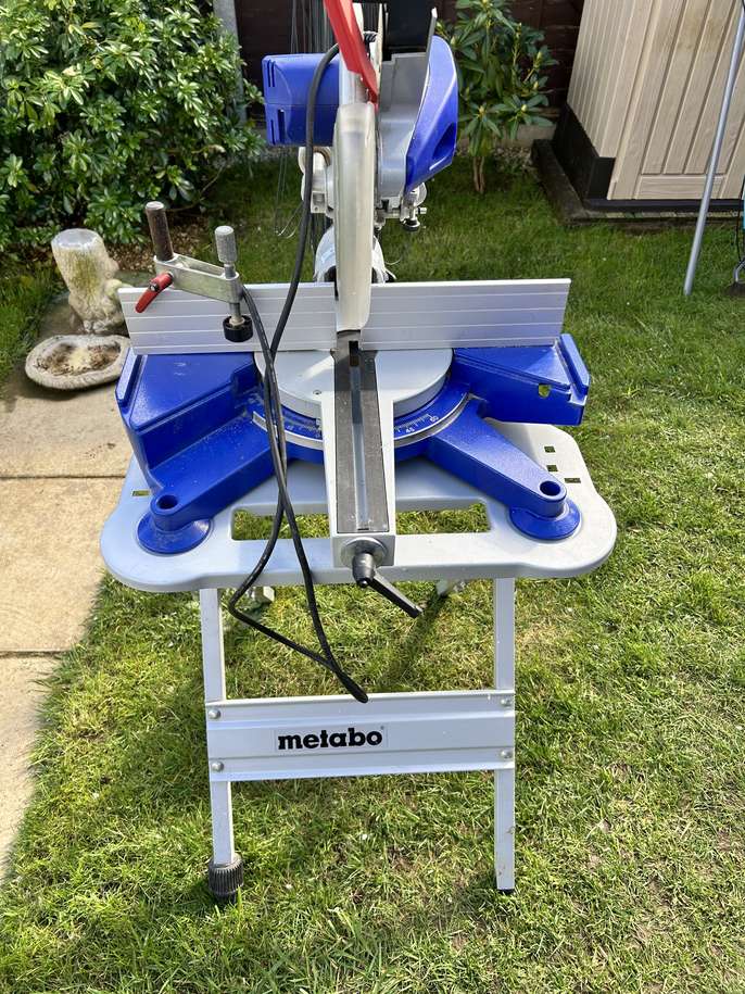 Here we have a Metabo 10 inch sliding mitre saw with double bevel capability. In very good condition and full working order with a decent blade on it which has 80 teeth and gives a good clean cut. Only had this a couple of years and not really getting the use that this saw deserves. Comes with original white Metabo stand as shown in pictures which folds down flat for easy storage. Not sure when this saw was manufactured but it is solid German engineering. A bit reluctant to let it go but just too big for my needs now. So if you are looking for a decent sliding mitre saw drop me a message. Can help with loading or even delivery if not too far from my home address.