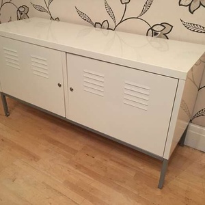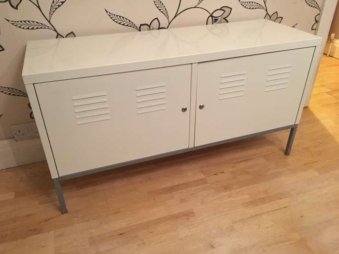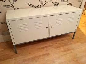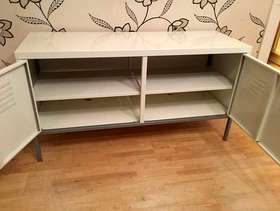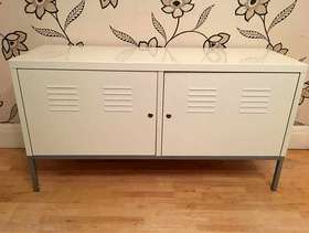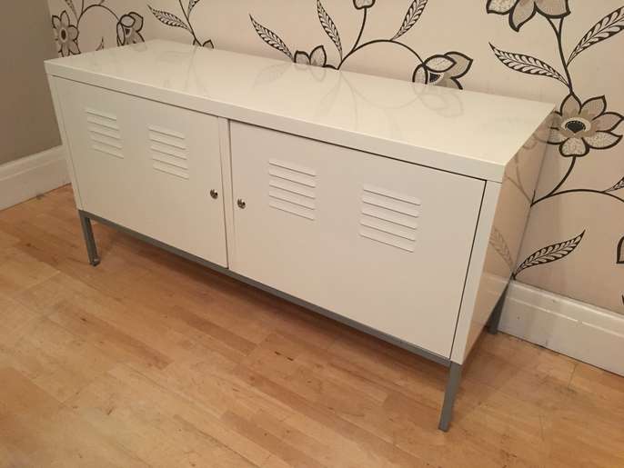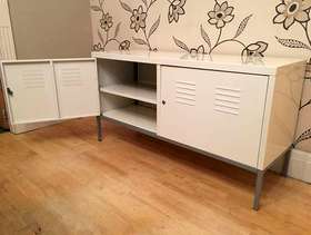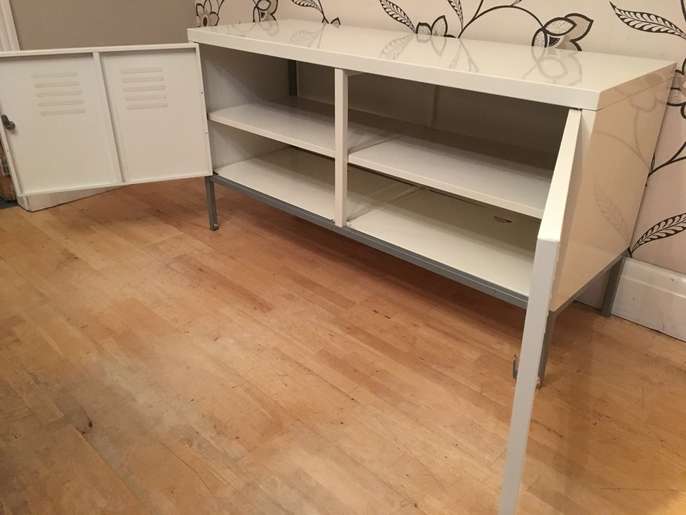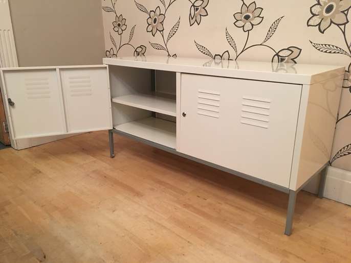 This handy metal storage chest is 118 cm long by 40 cm deep and stands 63 cm tall there are 4 shelves inside which can taken out to provide more space if needed please note there is no key but the doors open and close new locks can easily be added if needed