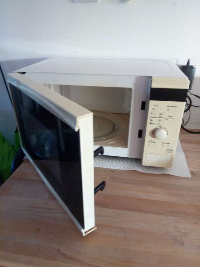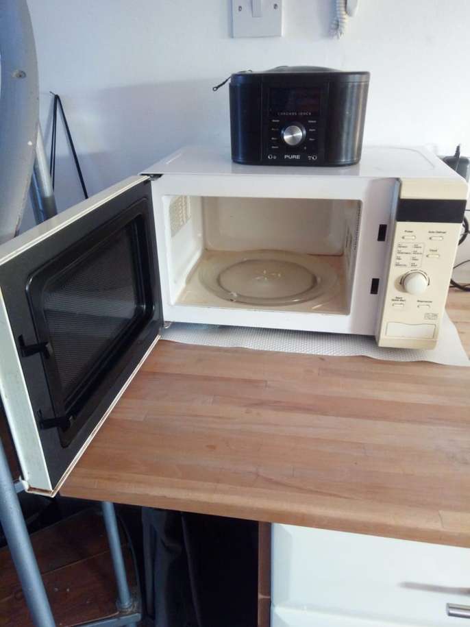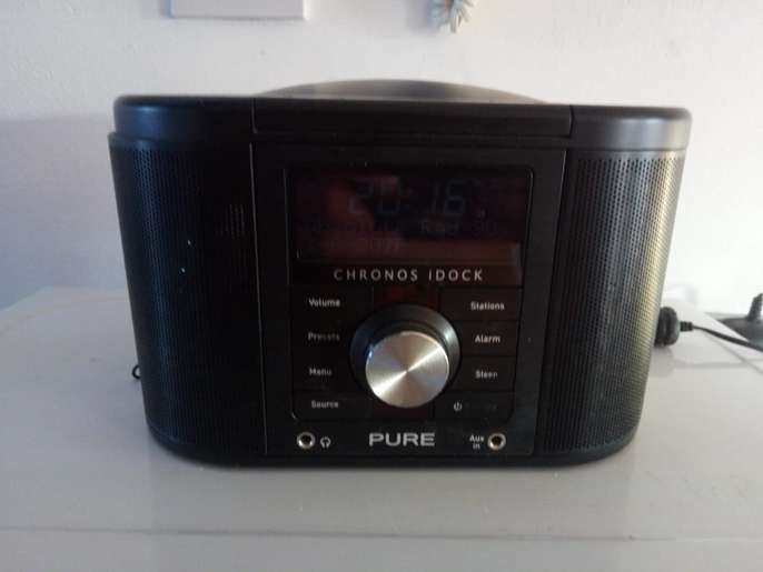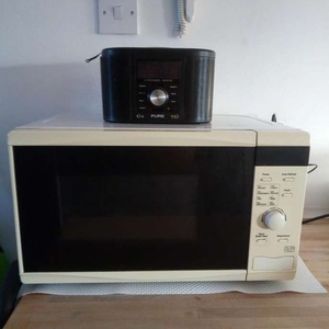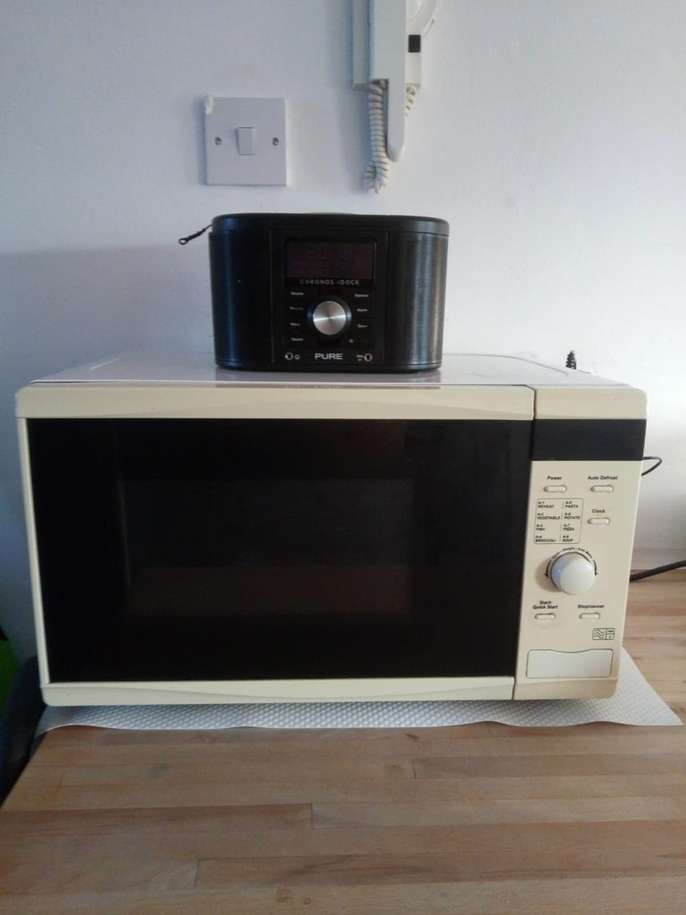 -microwave, cream, in good condition, efficient. defrost and heating function, colection only. selling because moving and cleaning space -5£ -Radio Chronos IDock, radio, iPod, headphone or audio plugs, alarms, sleep, everything excelent condition, works- 5£