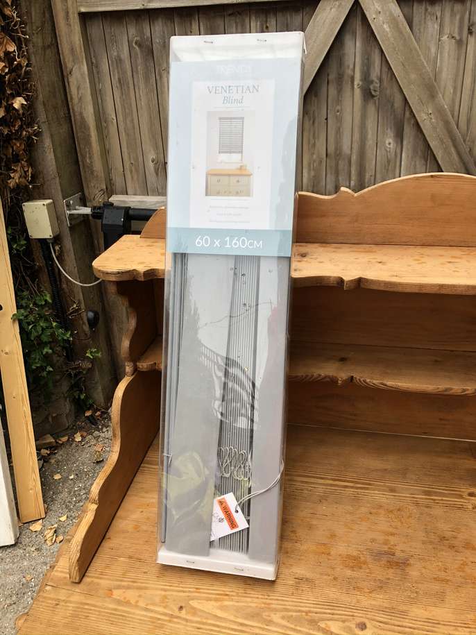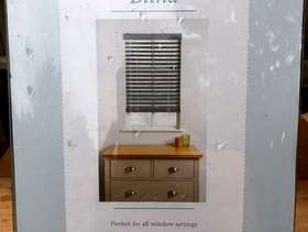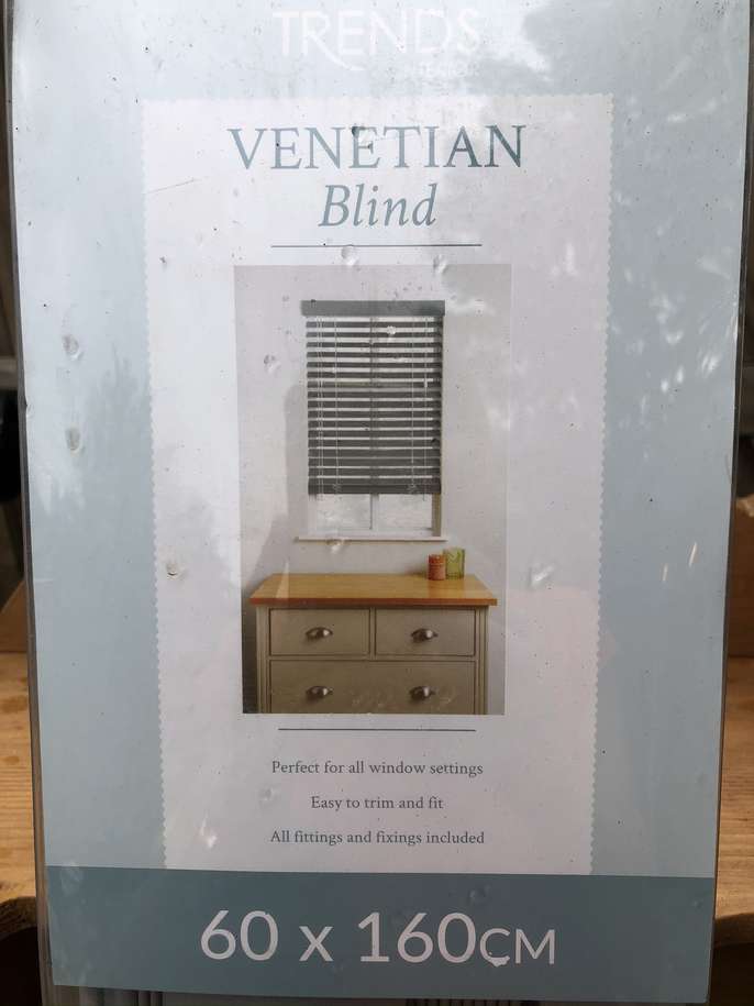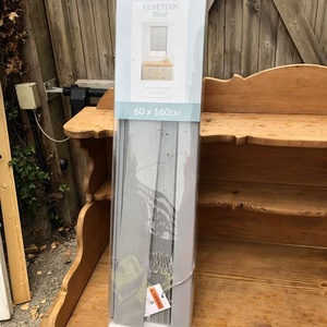 Brand new mid-grey wooden Venetian style slatted blind. 60cms x160cms. Still in box.