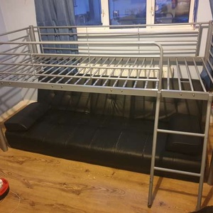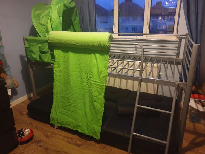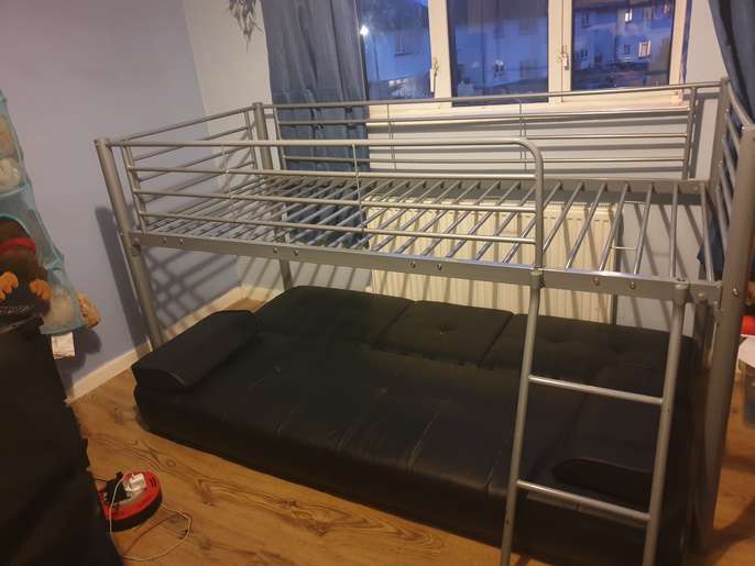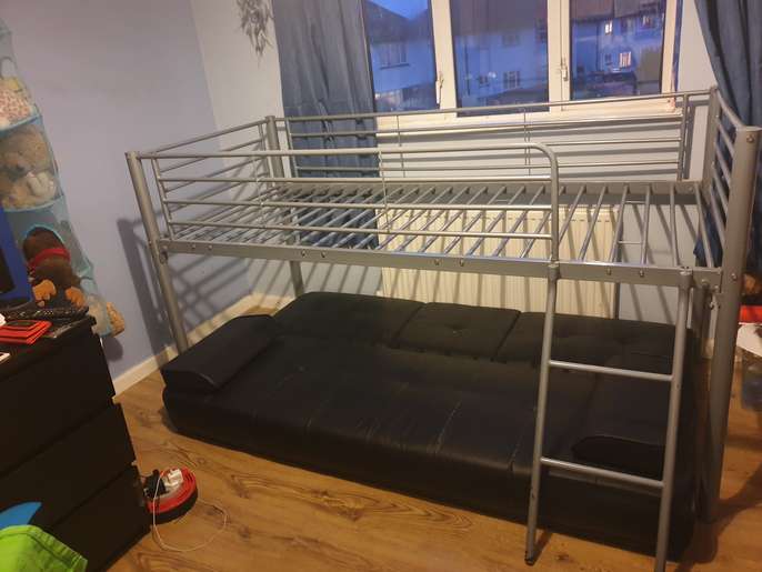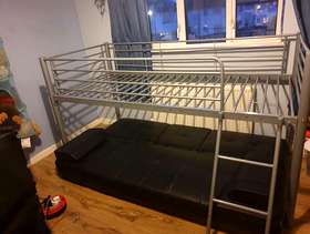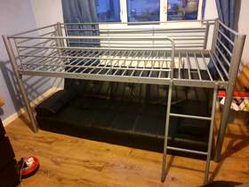 Mid sleeper metal bed with ladder £50. Ladder can be moved to either left or right position. Good for storage as space underneath. We had a sofa bed underneath but toys etc can be stored.