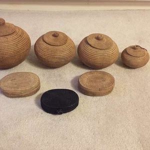 Seven little wicker baskets with lids, six beige, one black. Ideal storage for bits and bobs