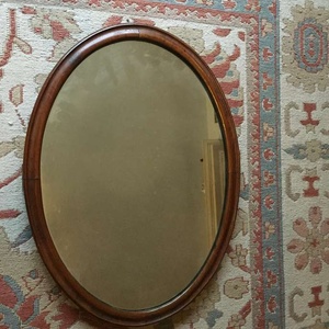 Oval - Wooden surround - beautiful polish on it - with wooden back. Originally would have stood on a stand over a dressing table. I’ve had it hanging longways for years. A couple of small spots under the glass as one would expect in an antique mirror but not noticeable.