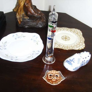 Just thought you would like to know that the odd glass 'thing' is a Galileo Thermometer and you read the temperature by the little silver tags - The bubble that sinks the most indicates the approximate current temperature.