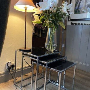 Three glass and chrome tables, excellent condition. Height 53cm x45cmx451
