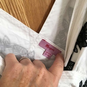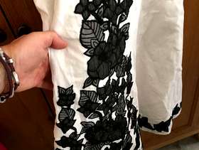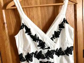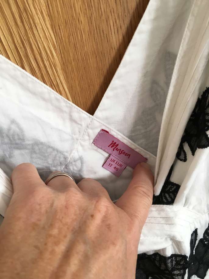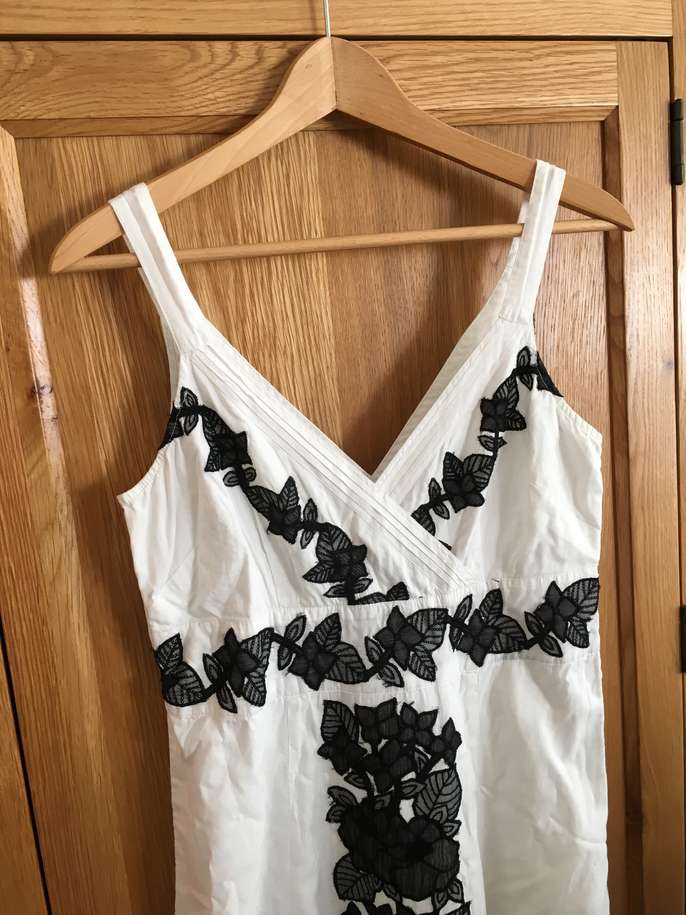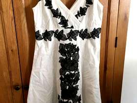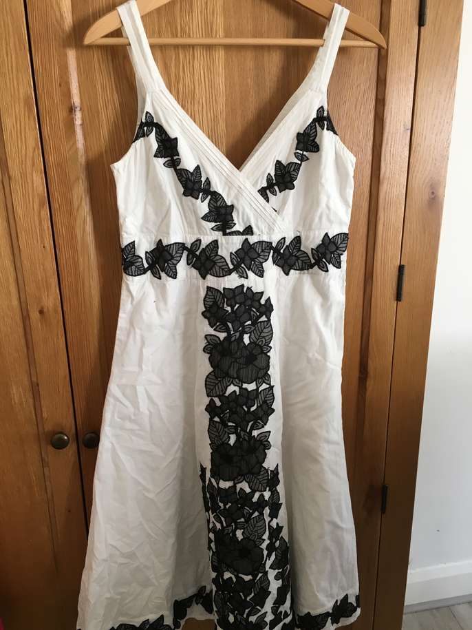 Used but great condition. No stains or marks. Gorgeous monsoon size 12 white dress with black lace effect flower pattern. Worn five times at the most. Cost new £120.