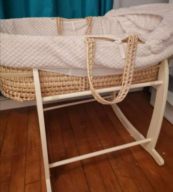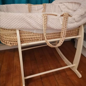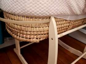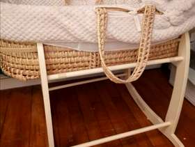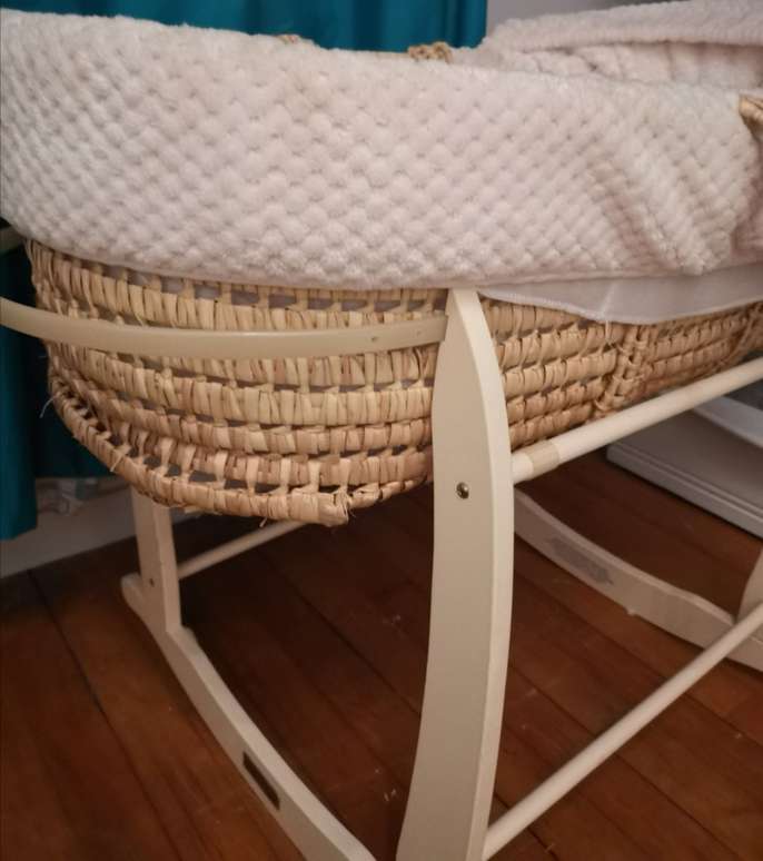 A lovely moses basket with cream cover and hood which is fleece material Stand that rocks Both in good condition Asking for £10 ono to go towards buying cot bedding for my son