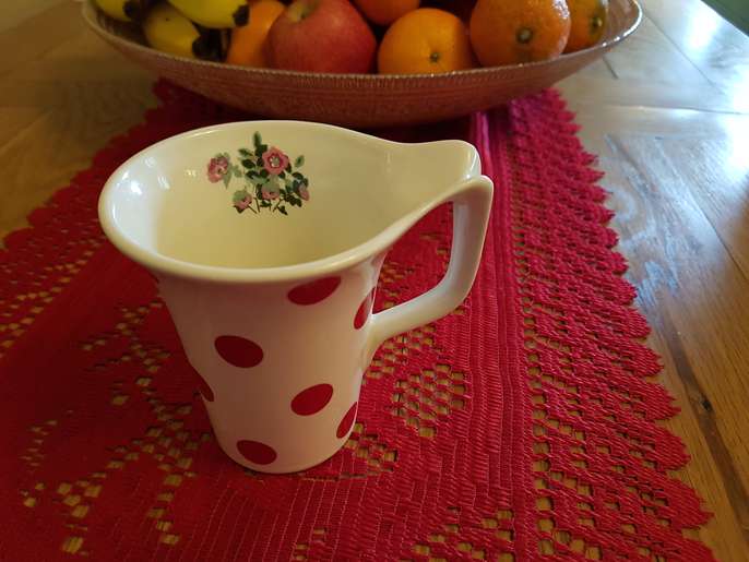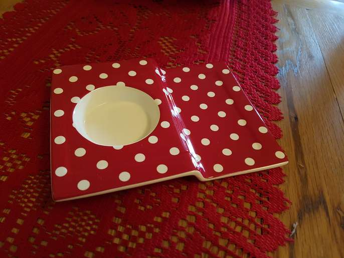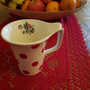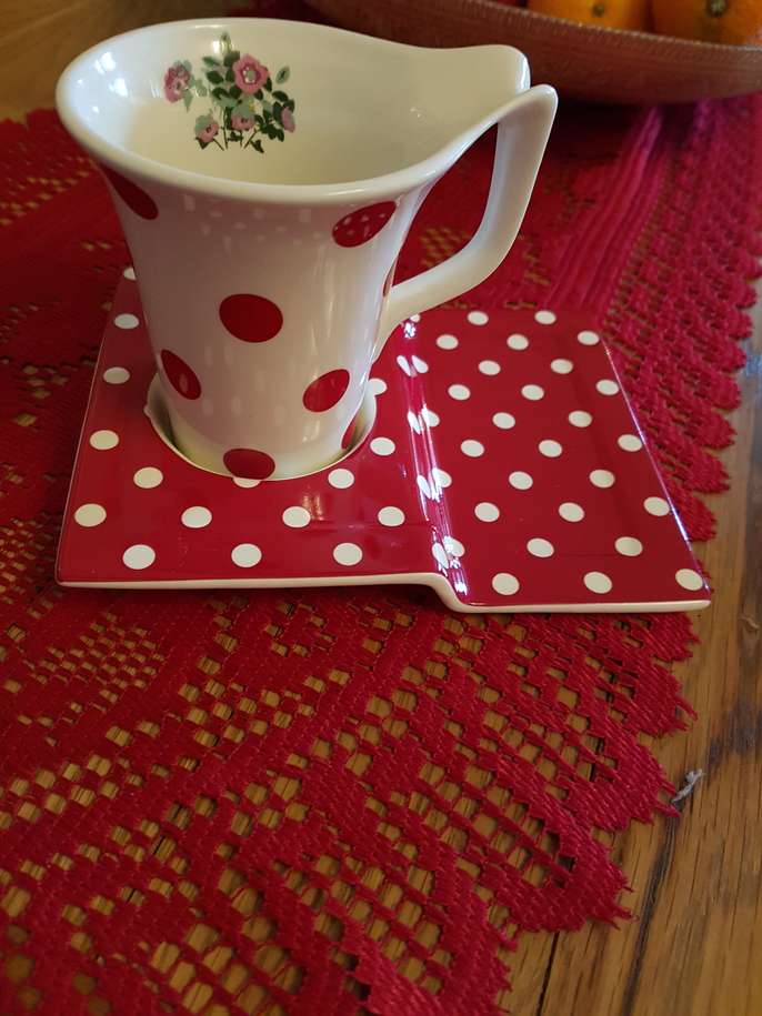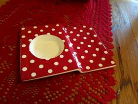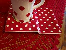 Red / white Polka Dot design , this item is new and would make a lovely gift . It is a joint mug & biscuit plate ideal for afternoon tea.