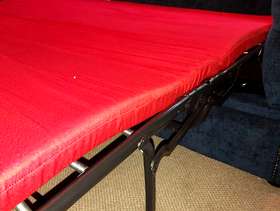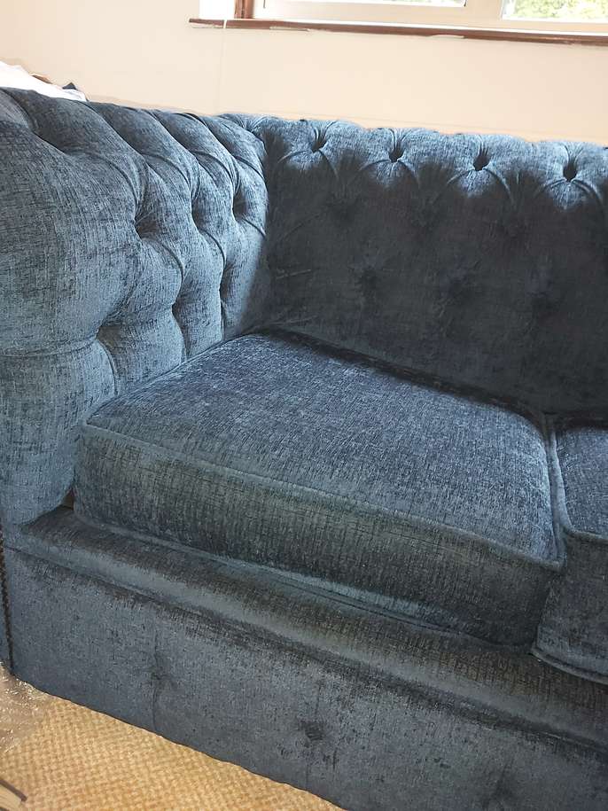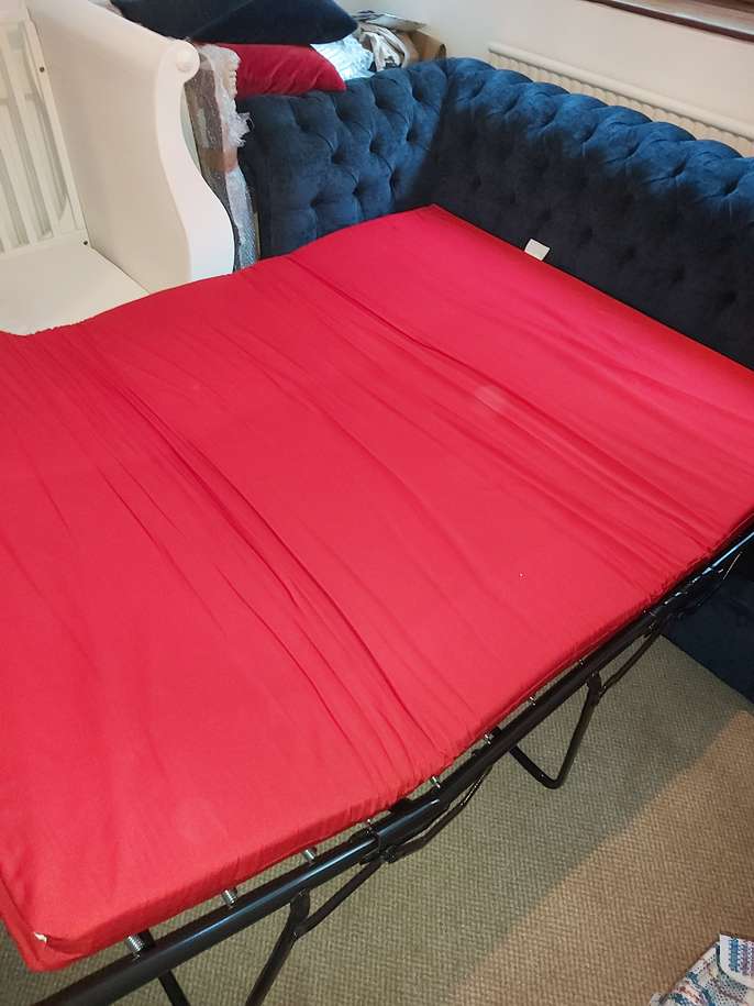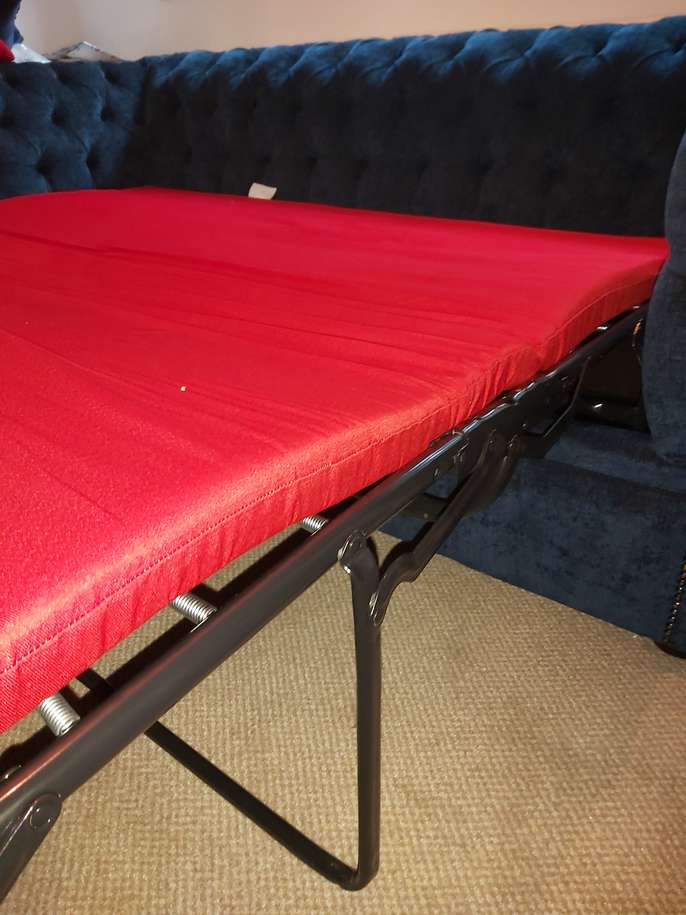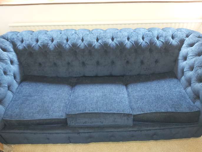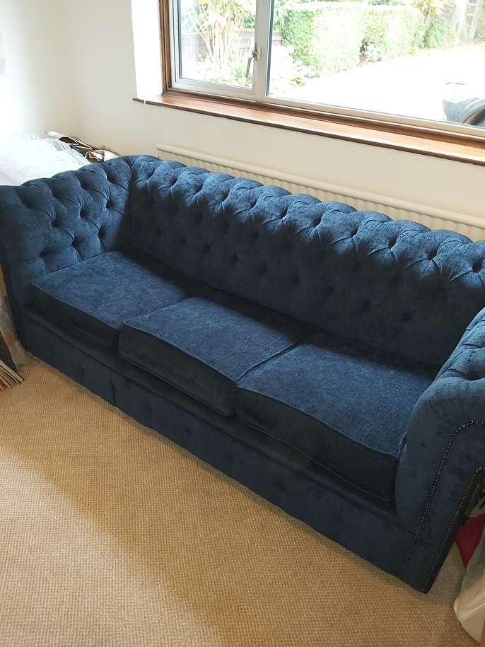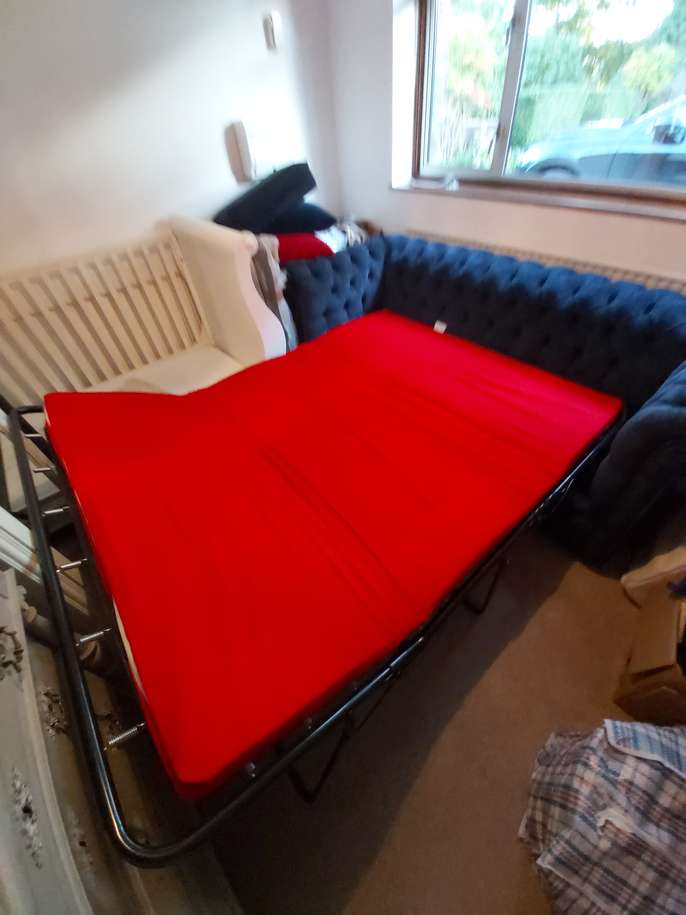 Navy buttoned back 3 seater sofa bed A darker navy than showing Used twice as bed and then mainly just as sofa so cushions have squashed abit Lovely item and sad to sell but no longer have space for it. Comes from smoke and pet free home Collection only and sold as seen