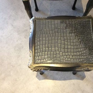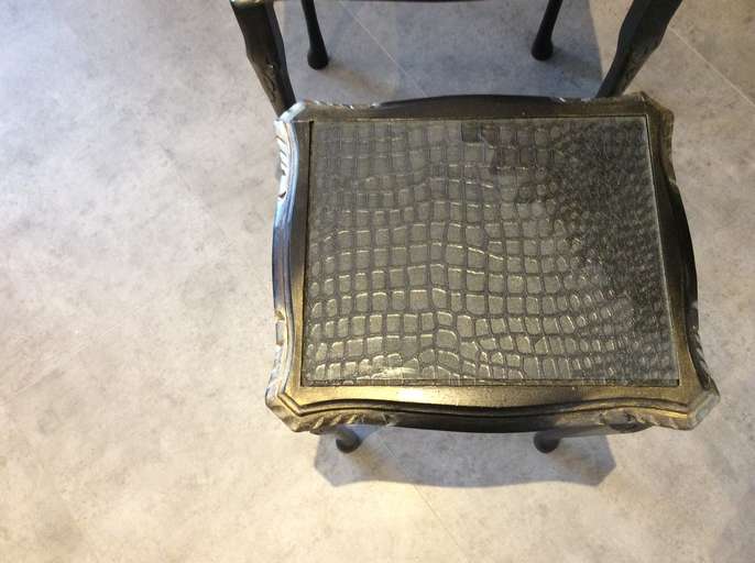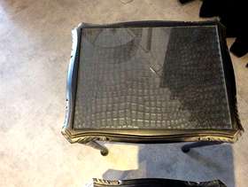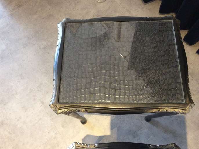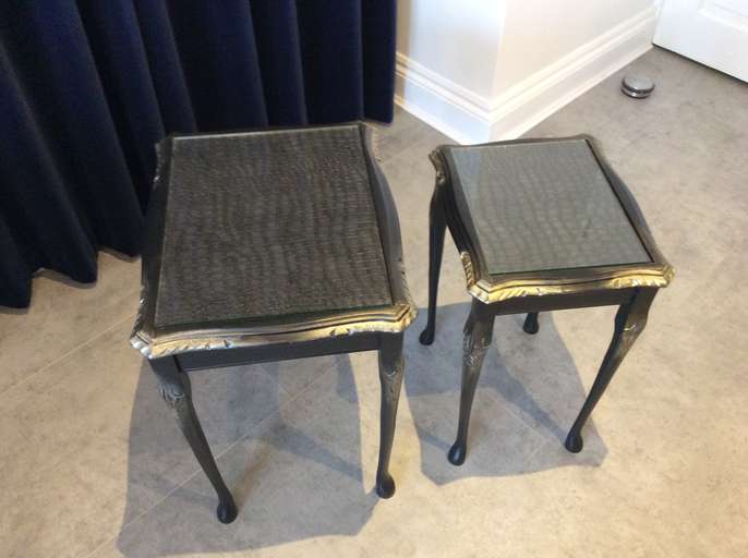 For sale are a set of two newly up cycled solid wood side tables. They are painted in black and embellished with gold gilding paste. The tops have a crocodile effect decoupage effect and still have their original glass tops also. The measurements are: Larger table: Ht 20”, width 17”, depth 14” Smaller table: Ht 18.5”, width 14’, depth 12” I have a passion for making old un-used furniture loveable again hence I just charge enough when selling to cover my material costs. I hope that these two tables find a new home! Pick up only from Tollesbury please.