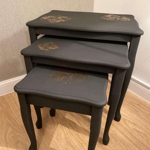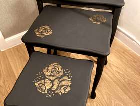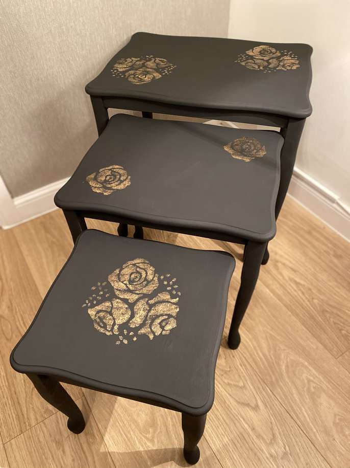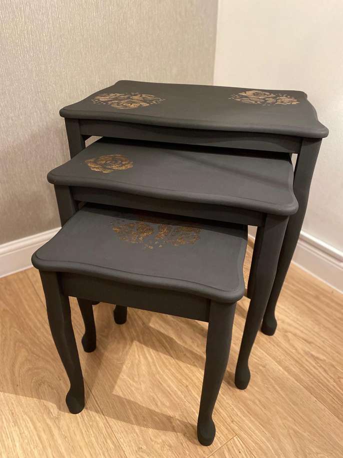 Beautiful black nest of tables Each table has lovely gold flower stencils Chafford Hundred collection RM166RZ These are also advertised elsewhere