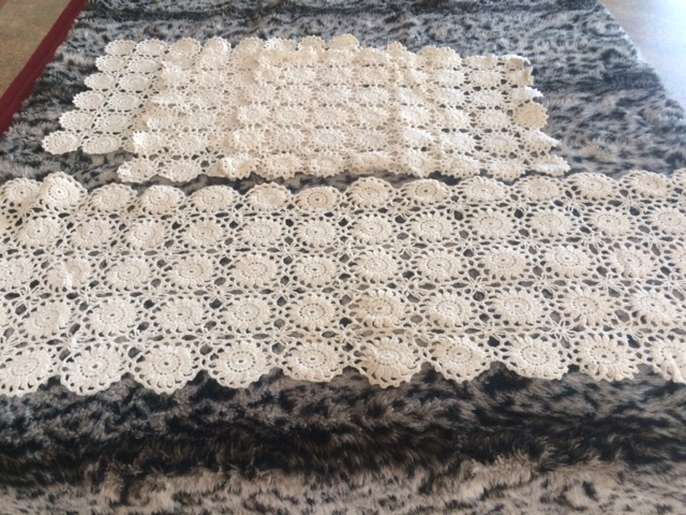 New and unused placemats and napkins Hand woven - lacey appearance 1 x Long placemat for table - 86cm x 30cm 6 x Placemat for seat - 42cm x 32cm 6 x Napkins - 37cm x 37cm Will make a lovely Christmas present. Collect from Guildford GU1 - near the Spectrum Leisure Centre. Will post to UK address for £5.
