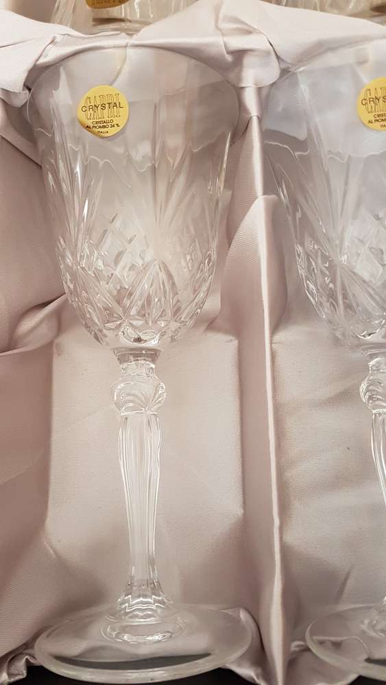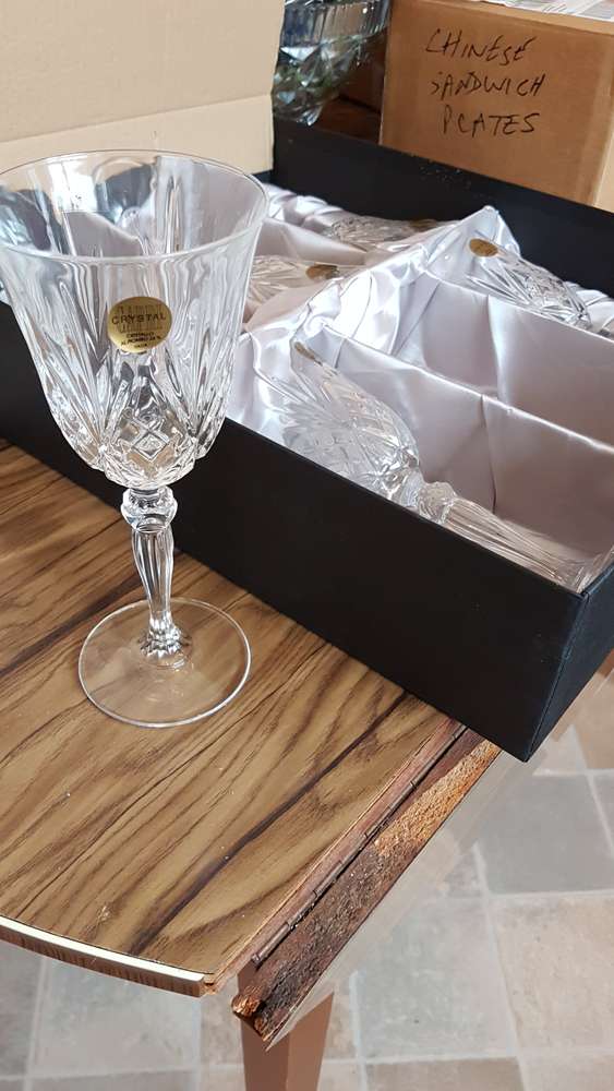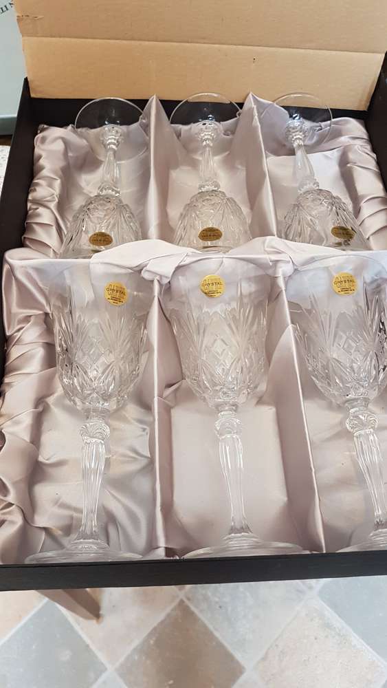 BOXED, 6 NEW ROYAL CRYSTAL ROCK WINE GLASSES 24% LEAD CRYSTAL FROM TUSCANY, ITALY Beautiful unused set of 6 cut glass 24% lead crystal wine glasses. Never been used, always kept in its original box and each glass has authenticity sticker. I am downsizing and these plus other items : 6 Whisky Glasses - https://www.freelywheely.com/listing/forsale/new-box-royal-crystal-rock-6-whisky-glasses 8 Tall Glasses - https://www.freelywheely.com/listing/forsale/new-boxed-royal-crystal-rock-8-tall-glasses have to find a new home! See pictures for size Please note - if you want to buy all 3 sets, contact me for a special price