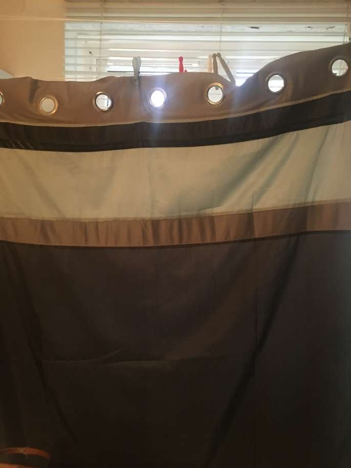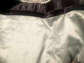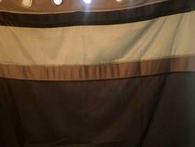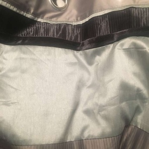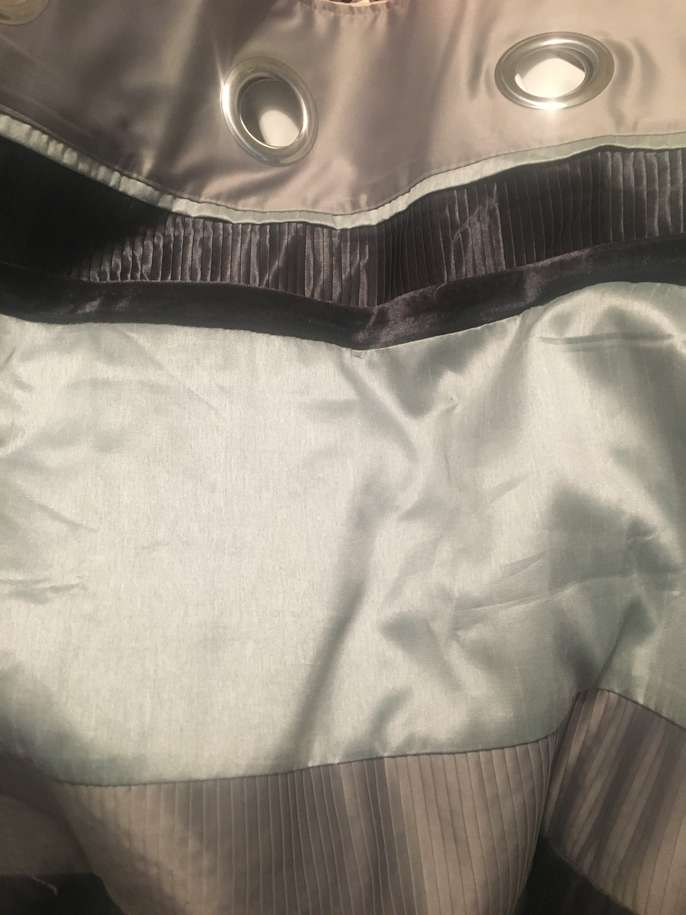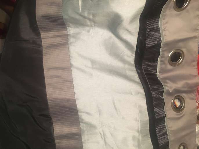 Next curtains , grey, light grey with charcoal velvet strip . Modern and would go with any decor , slight satin texture