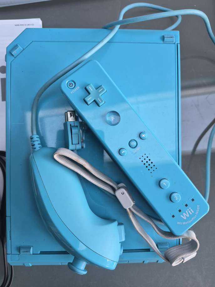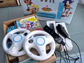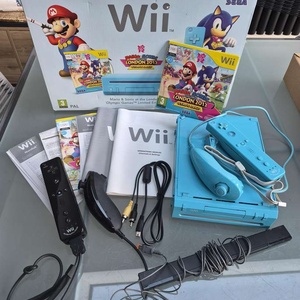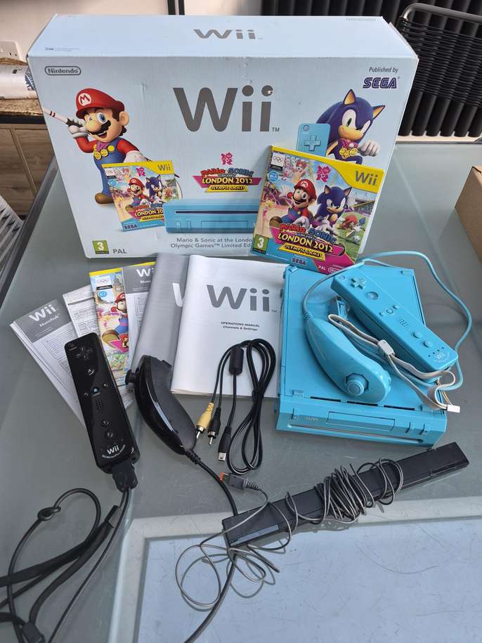 Good condition boxed but Charger NOT INCLUDED (charger available from Ebay for approximately £8-£10) Included in Bundle: Black numchuck and x2 Official Nintendo Wii Steering Wheel RVL-024 Compatible With Mariokart included (see all pictures). Features Country of Origin: China Colour: Blue Resolution: 480p Brand: Nintendo Region Code: PAL Platform: Nintendo Wii MPN: RVK-S-BAAF Features: Wi-Fi Capability