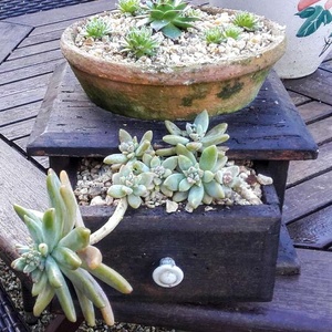 A small wooden drawer filled with a succulent which will have small yellow flowers and a vintage terracotta dish with sempervivums. Can go outside.