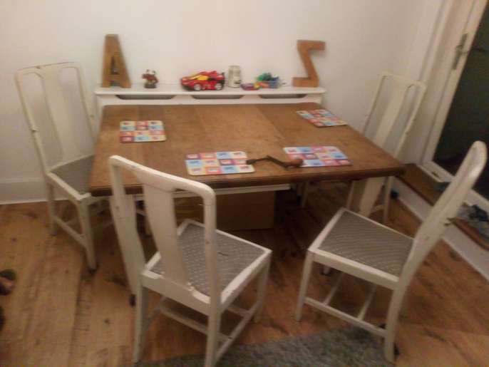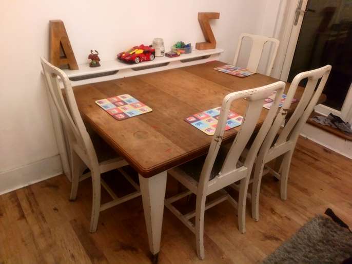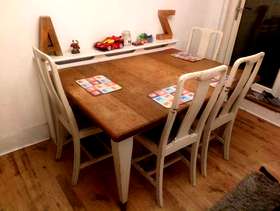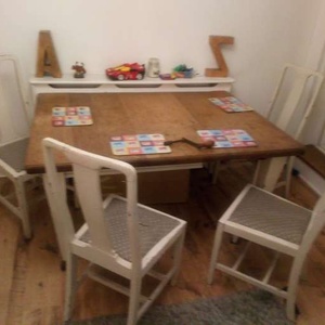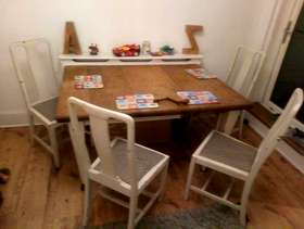 Arthur Newbury of Reading, Extendable oak table and 4 chairs, 40" wide, 56" long, (extended) 42" (retracted), 29" high on casters, could do with a bit of tlc but not much (kids!!!)