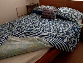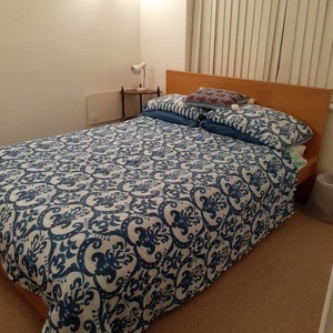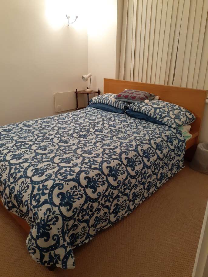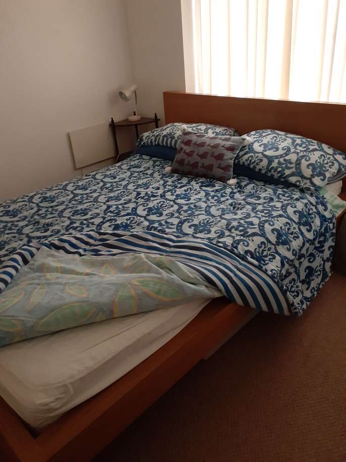 Solid oak wood bed and headboard. 150 cm wide x 205 cm long mattress & Matress protector. Mattress turned regularly and vacuumed at each linen change. In good clean condition. No bedbugs. Comes from a clean household. It is a really comfortable bed. Reason for selling - my housemate of 2 1/2 years has recently moved back to New Zealand. That room was kept as a spare room and was seldom used. I am getting a new housemate who has her own bed. The bed is easily dismantled as the base is made up of wooden slats, which makes the bed easily transportable. All that is needed is a screwdriver which I have on-site. Ground floor flat so easy to transport Actual exterior size, including solid oak frame is 155 cm width and 212 cm length. Does not have a foot end. ie. a tall person does not have a shelf to limit the length. Like a book end. It is only a head board, not a foot restriction. A really comfortable bed.
