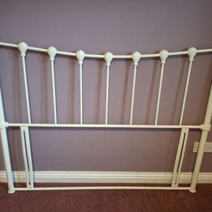 Cream coloured tubular metal ornate headboard with shell design. In good condition and comes with fixings.