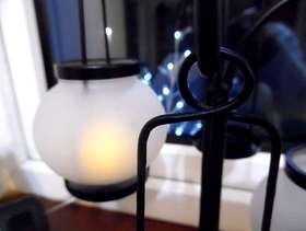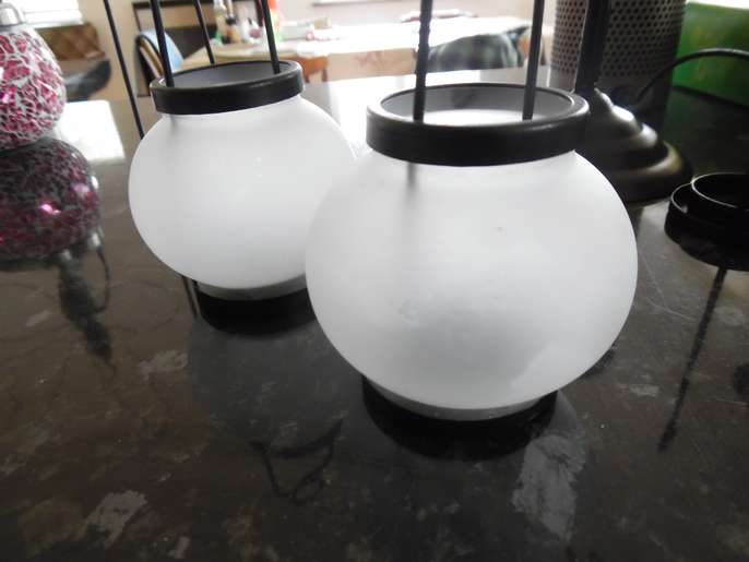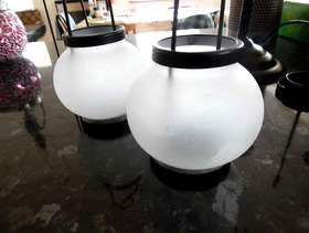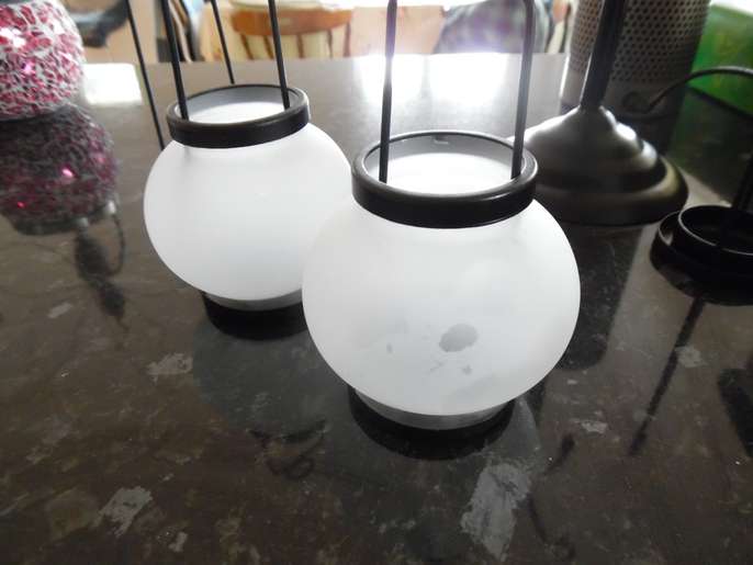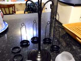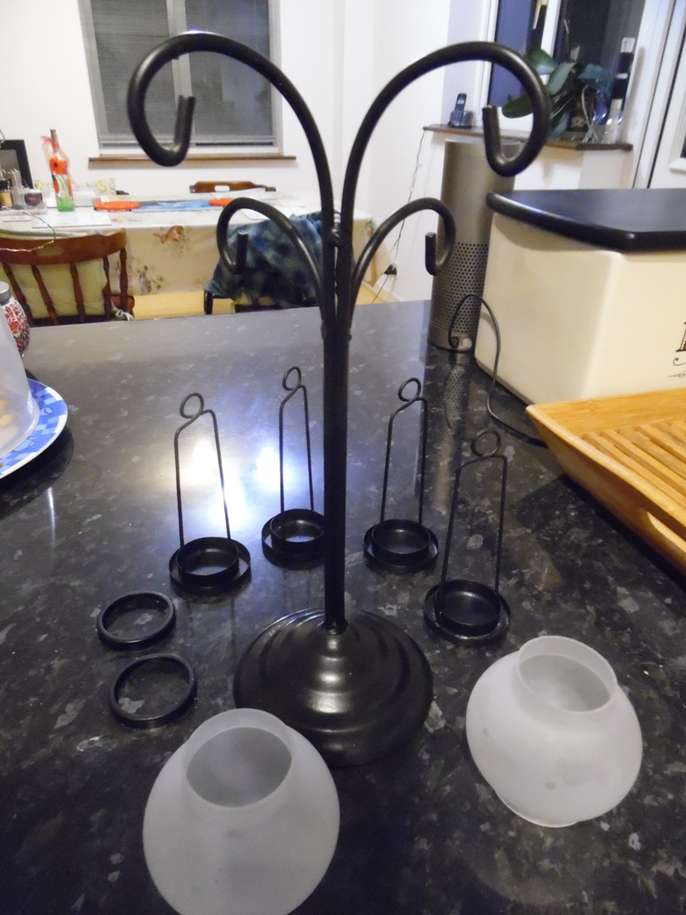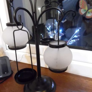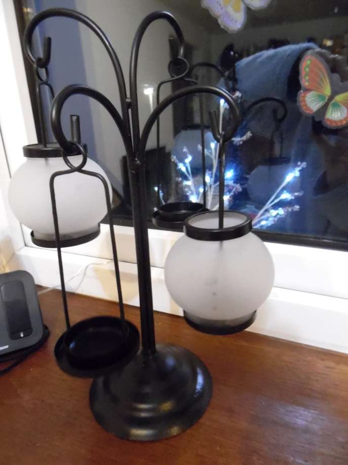 Beautiful Tea Light Holder with Black Metal Base & Smoked Glass Globes. *Holds up to 4 tea lights or small candles *2 of the hangers come with smoked glass globes to give you the option of a softer glow. [Please note the item was previously used & has been cleaned although some minor splashes of wax may be seen. In addition, the smoked glass globes have a couple of patches where clear glass shows through (see pics for a closer look).] Dimensions are as follows: Stand 11 inch tall by 7.5 inch across (when globes attached). Base 4.5 inch across. Globes 3 inches across.
