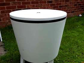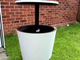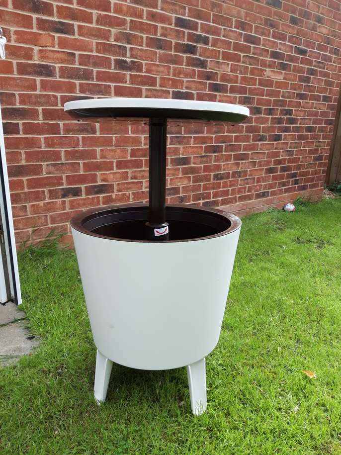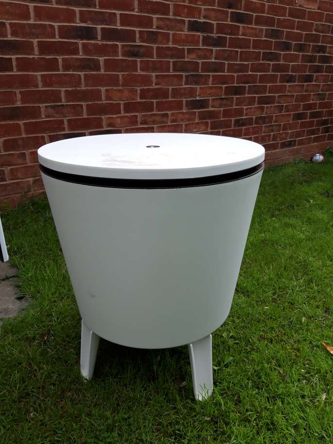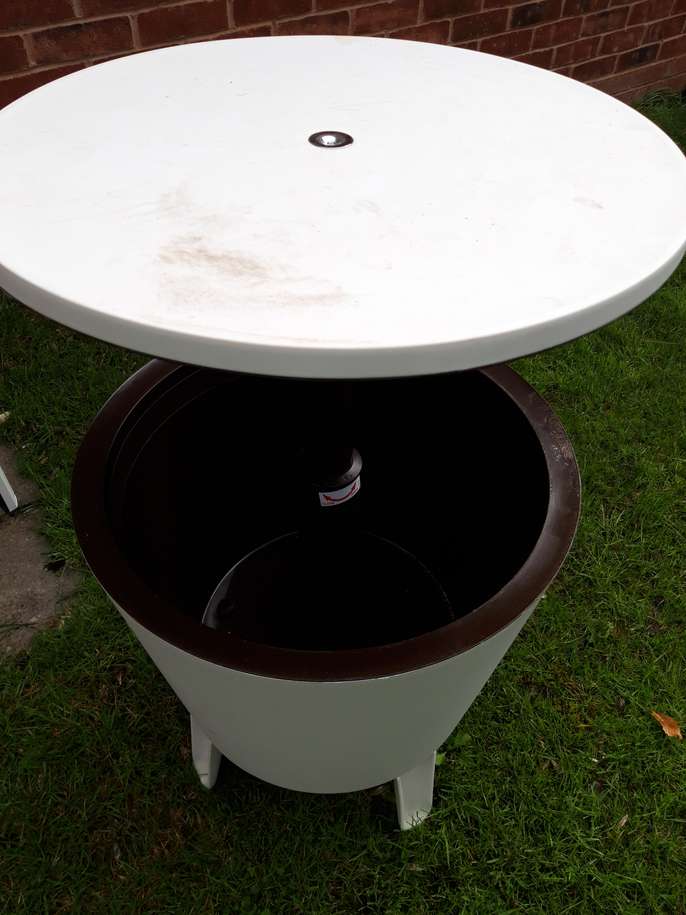 Aldi white table . Opens up for storage of drink and ice then closes for the table. Used once. Needs a clean