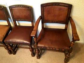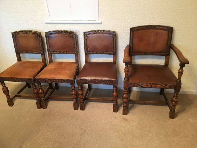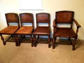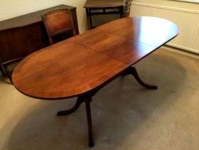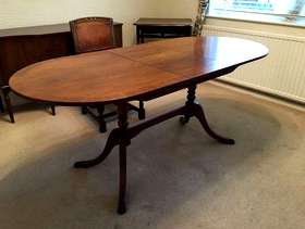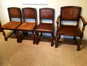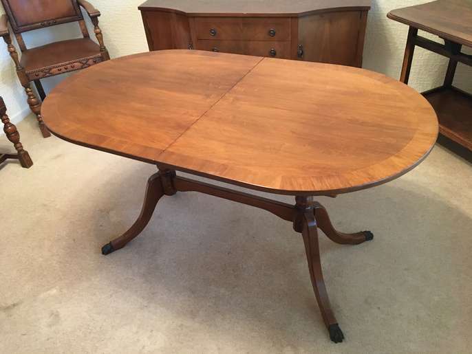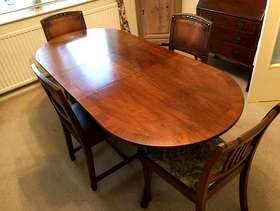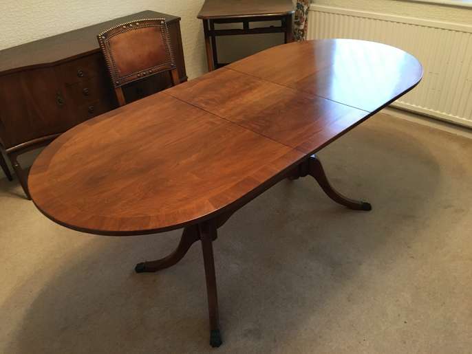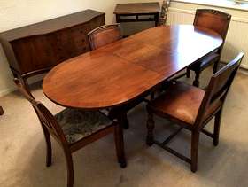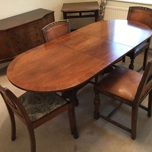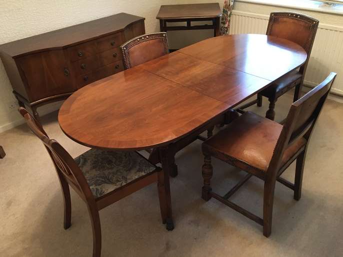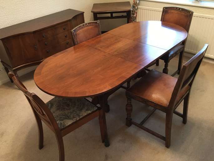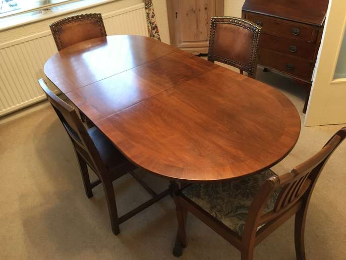This very well made extending dining table comes with 3 standard chairs and a chunky carver the table with the central leaf in place measures 175 cm long by 79 cm wide it stands 74 cm tall and is on castors for ease of movement it comes from a smoke/pet free home and i can deliver to the local halifax/bradford area for a £10 delivery charge